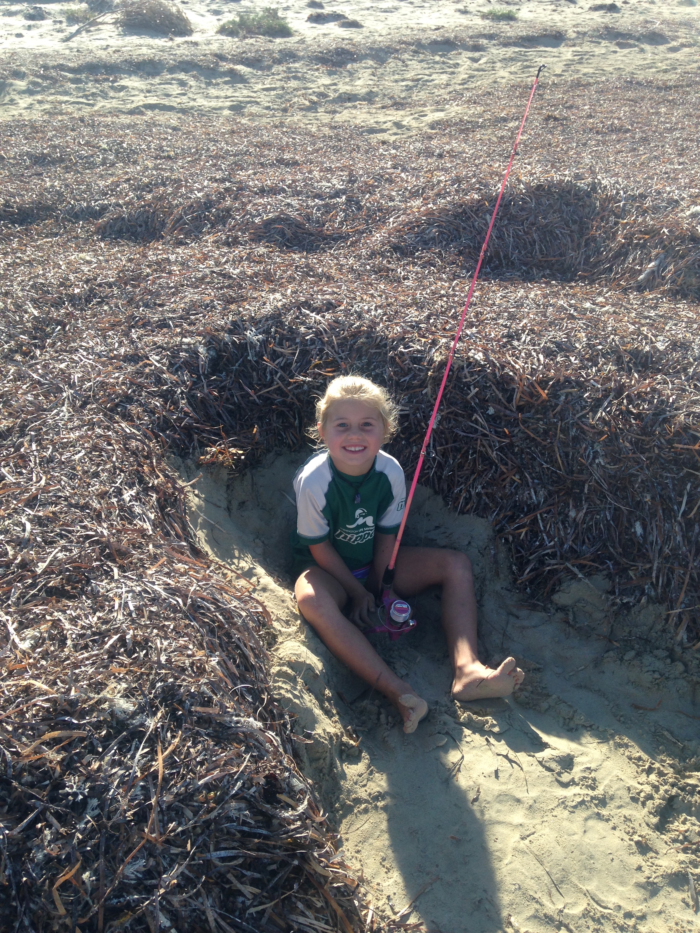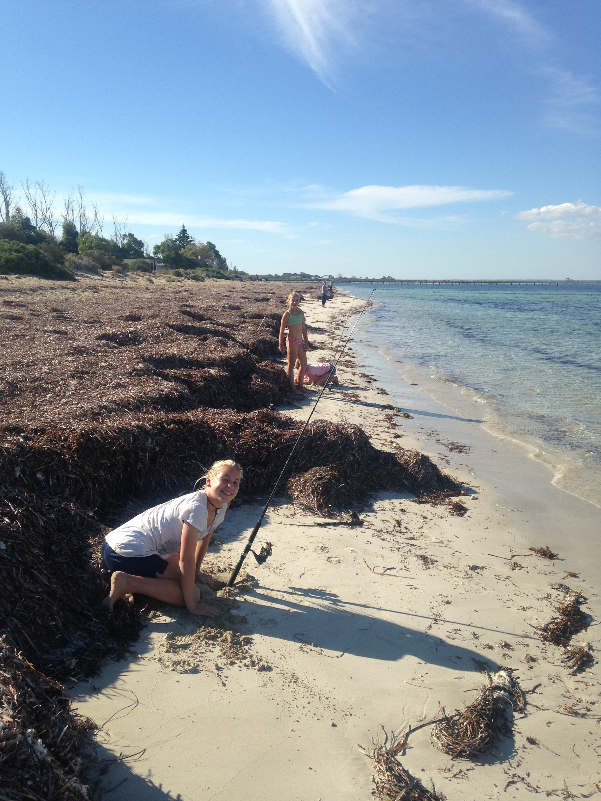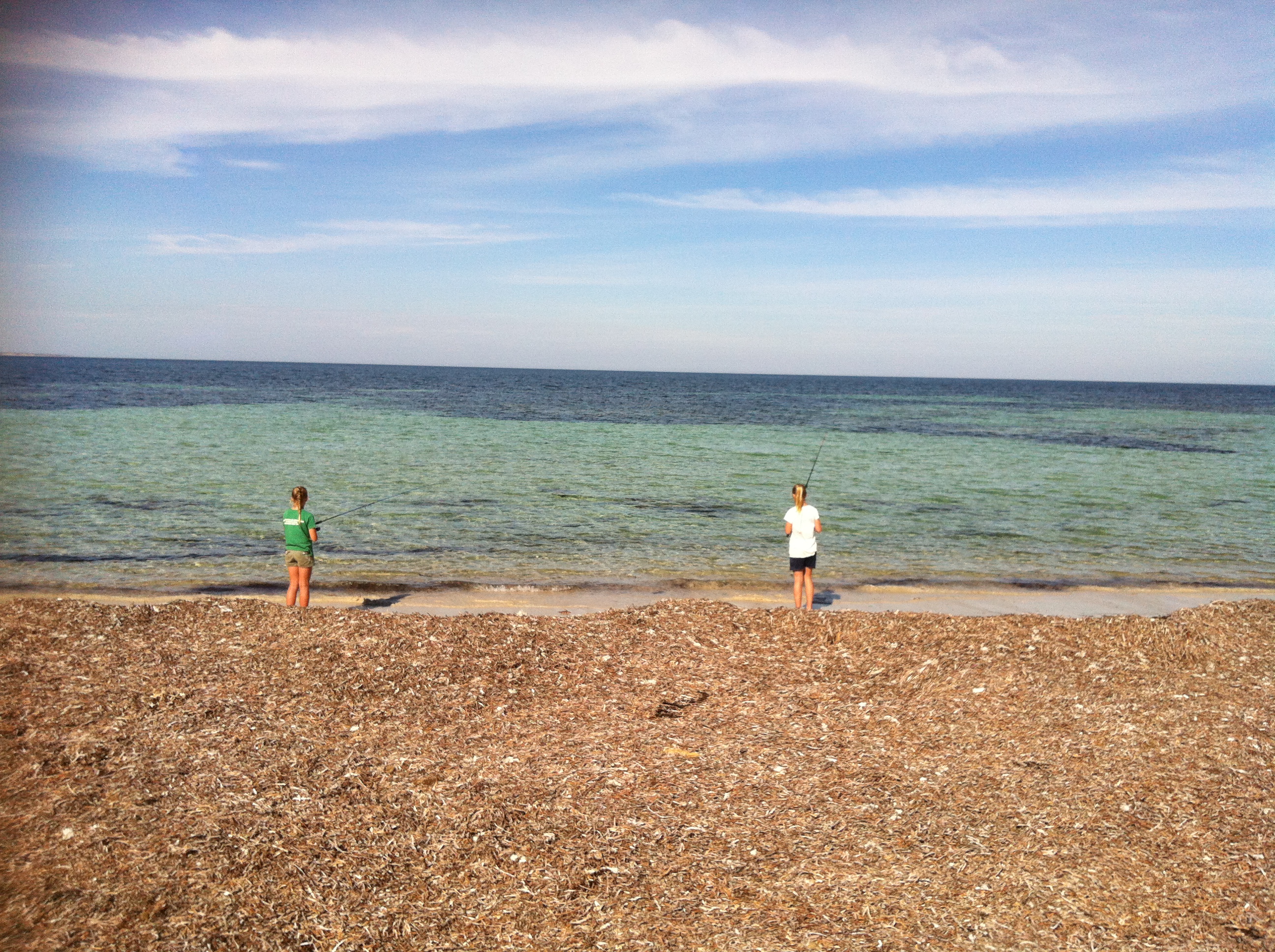 Fishing off the beach among the seaweed.