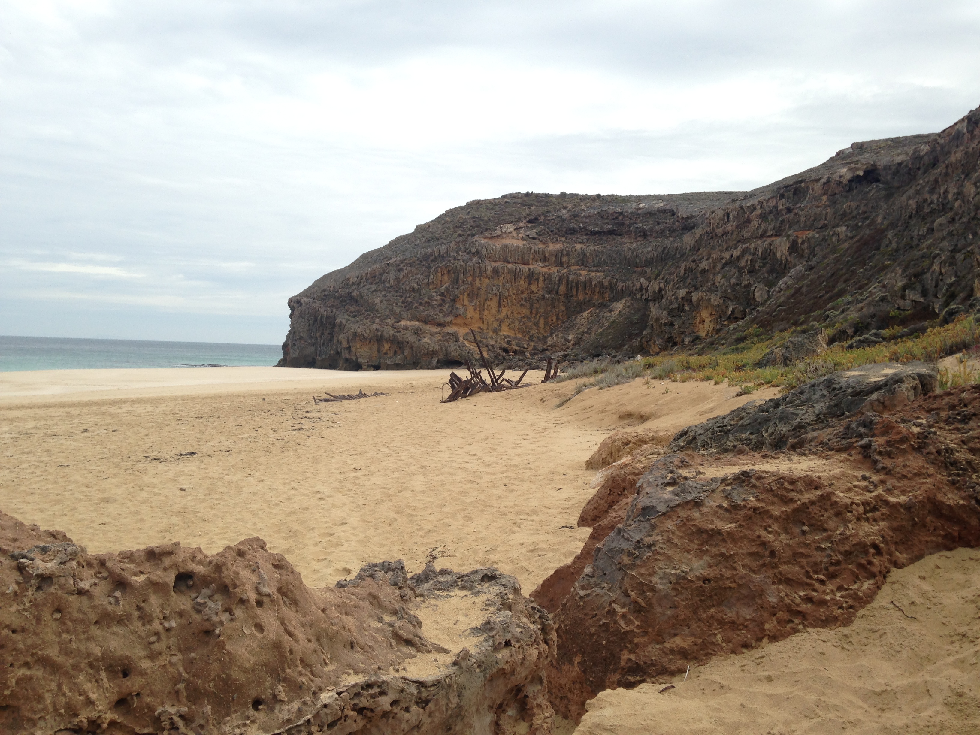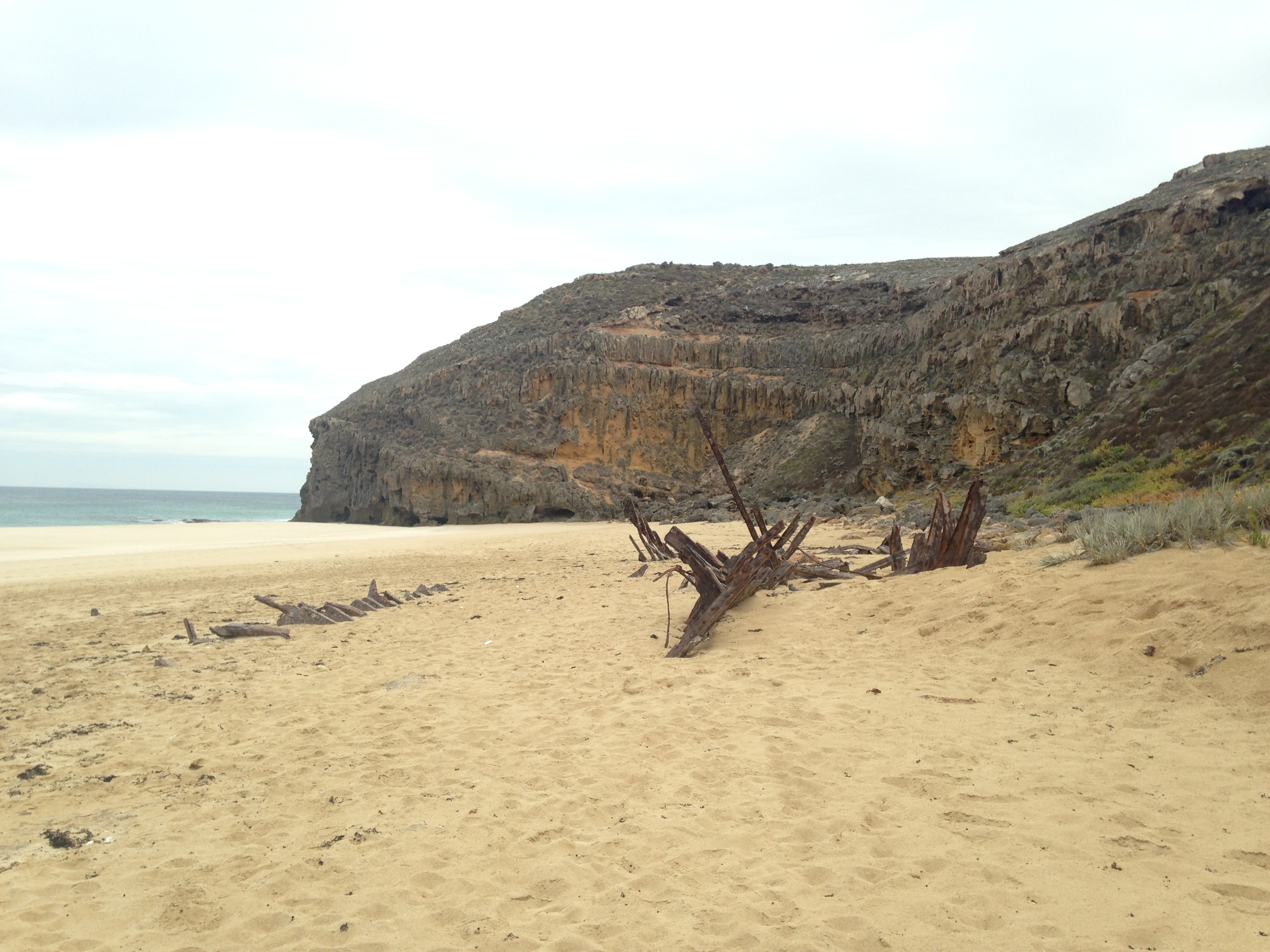 The shipwreck at the base of the cliffs.