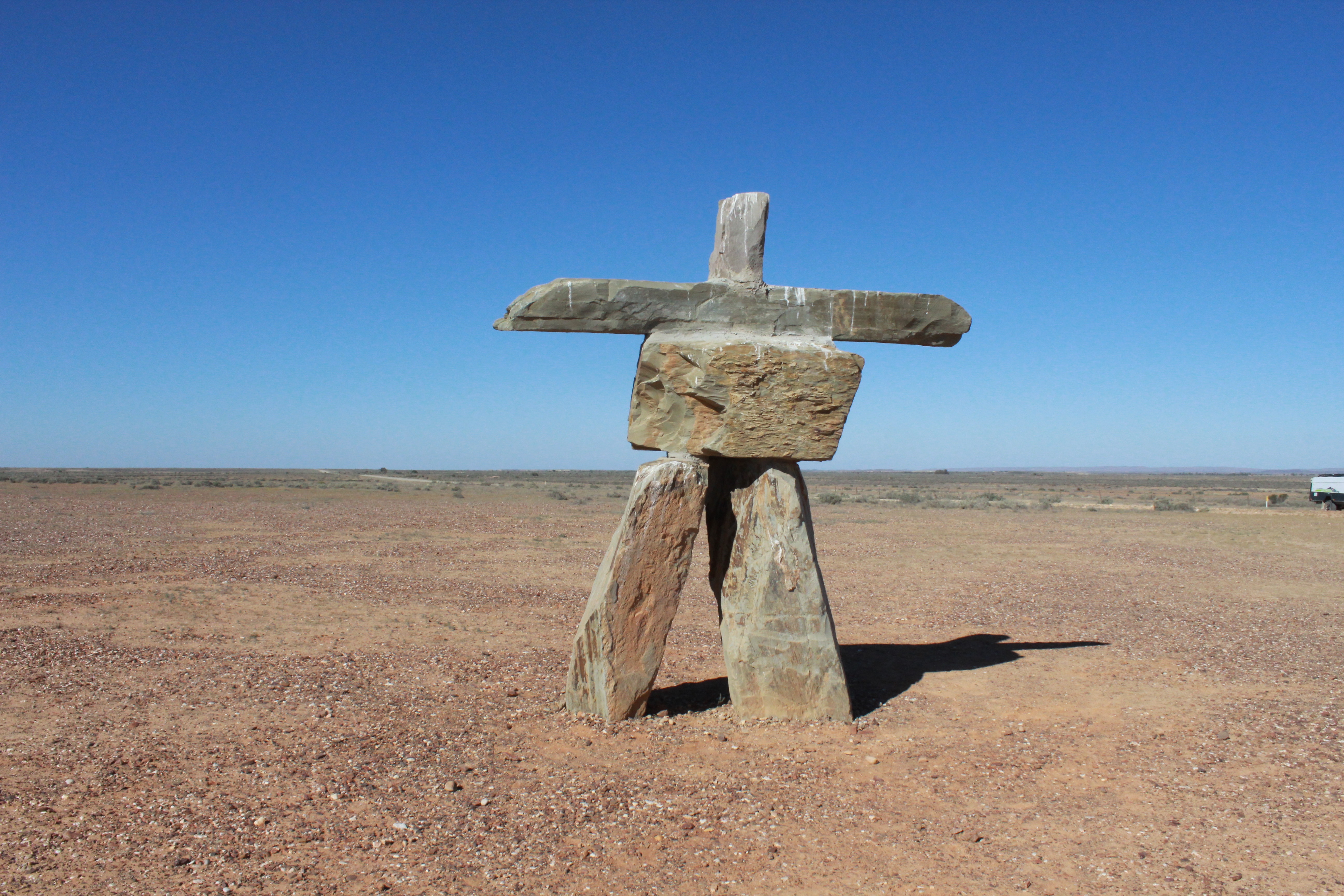 We finally left Marree after lunch, stopping to take a photo of the car in front of the infamous Oodnadatta ‘OPEN’ sign, to head towards our next destination, Coward Springs, about 130km’s away. Of course we cranked up the stereo with a bit of Aussie Crawl and cruised on down the immaculately smooth dirt highway. I don’t think either of us have ever felt so Australian!!!Occasionally we had some minor corrugations, but for the most part the road was great, giving us a very smooth ride. However this drive is not just about getting from one place to another and we made a few interesting, quirky stops along the way. First stop was at Wangianna, where a stone sculpture of a man had been erected just off the side of the road.