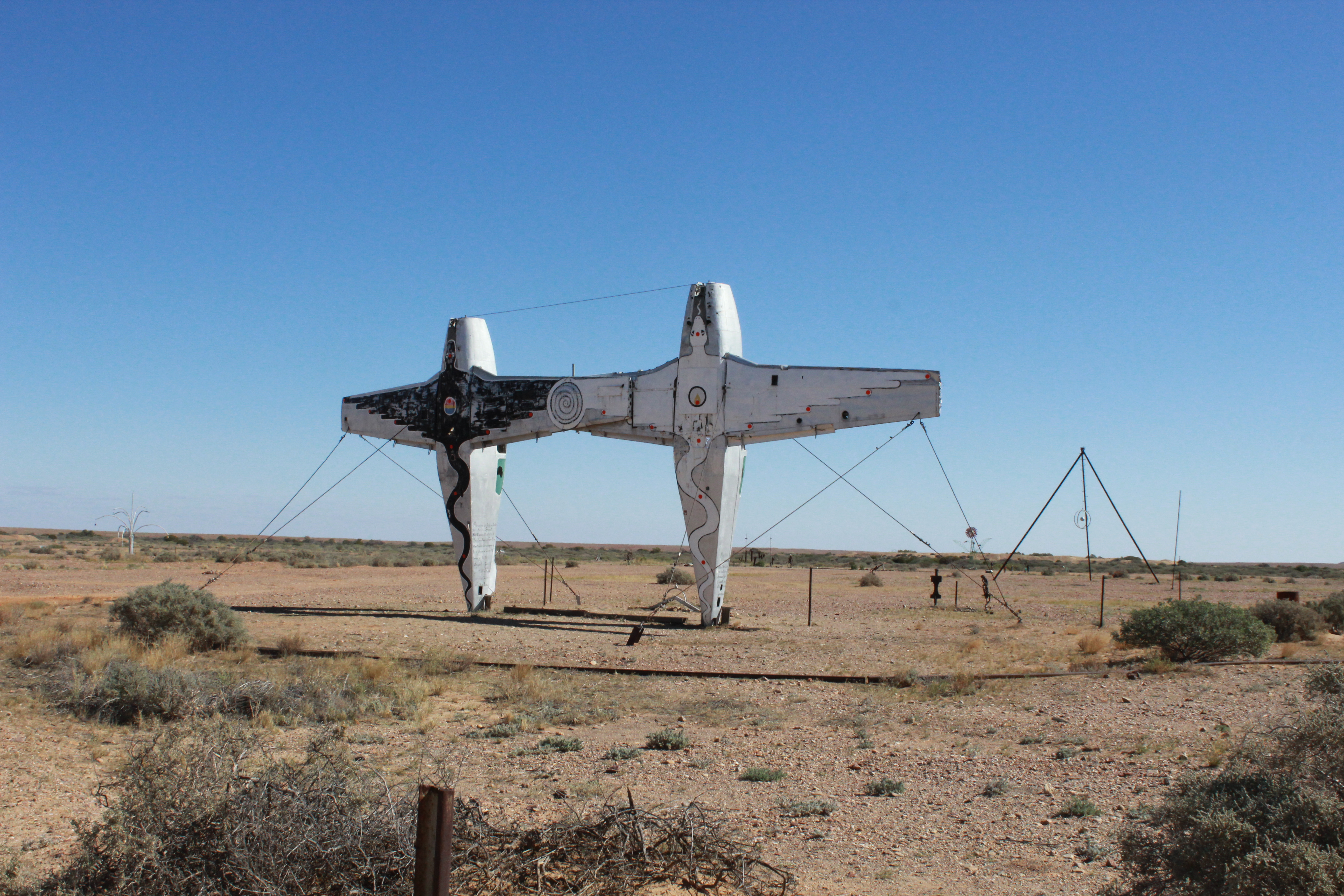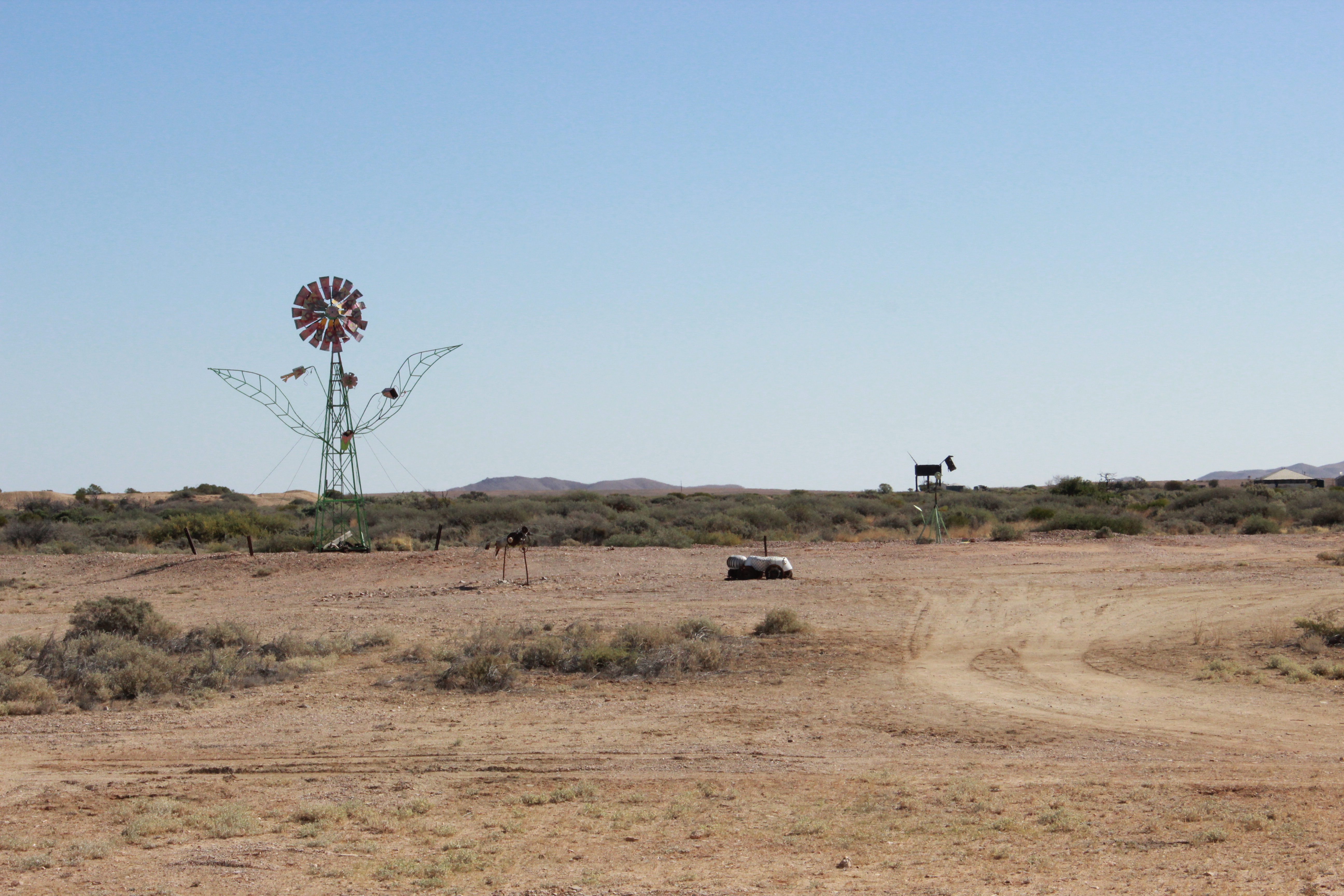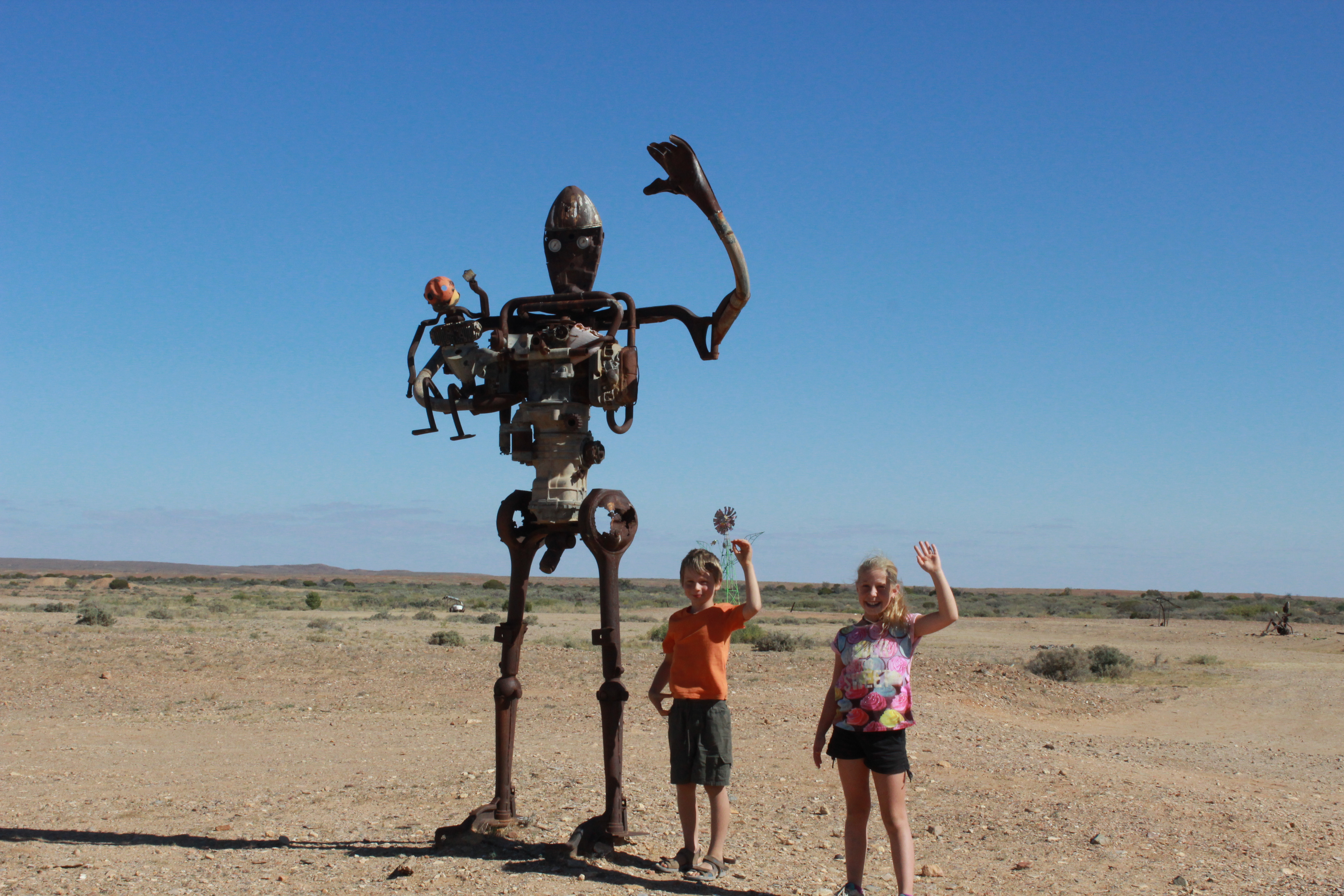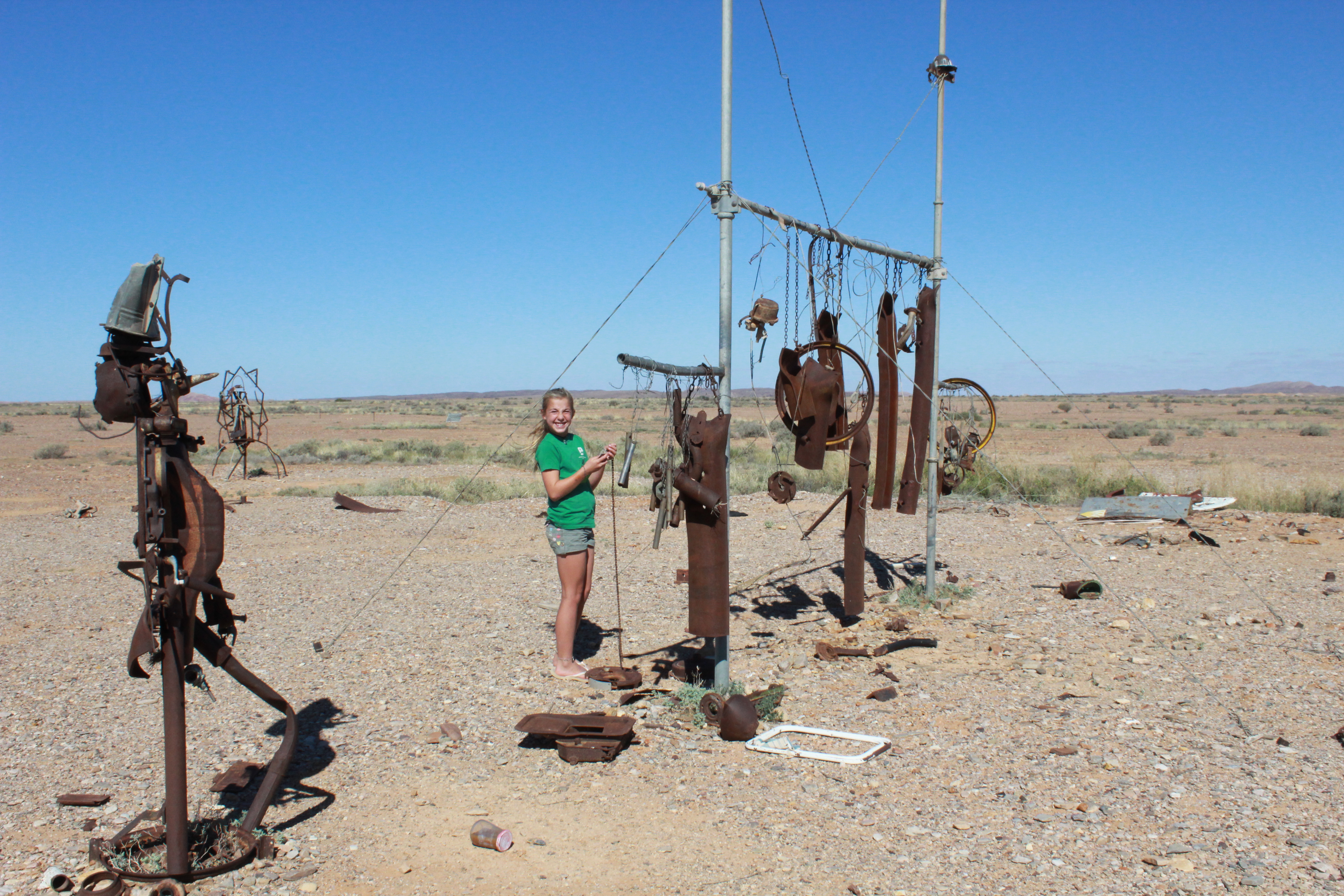 Further on we stopped to have a good look around at Alberrie Creek. Alberrie Creek was visible from a few hundred metres away and was simply a paddock on the side of the road filled with two big planes, a huge dog made from water tanks and sculptures made from windmills, bits of old rusted metal and general junk. We had to drag the kids away from one particular sculpture which was set up as a ‘music tree’. The kids were banging on all the different bits of hanging metal junk making quite a great racket.