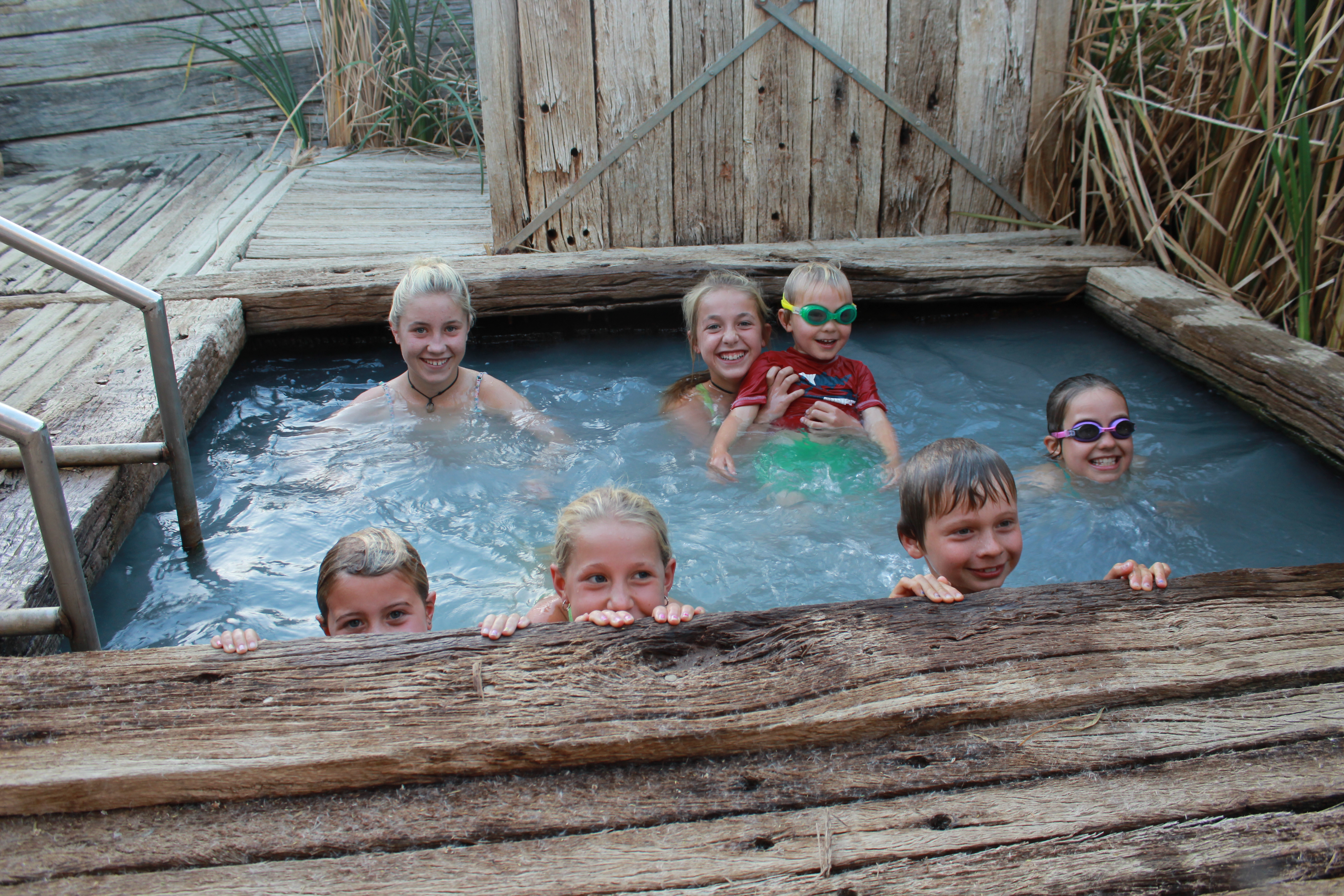 Finally after a long day we turned in at Coward Springs, a natural spring and permanent wetland oasis in the middle of nowhere. Coward Springs is privately owned by Greg Emmet and Prue Coulls since 1991, when they began to plant hundreds of locally native trees, built facilities and restored the original buildings. In 1998 the site was even added to the South Australian Heritage Register. They have done a great job building up quite a lovely campground for travellers to camp at under the many date palms and athel pines. The facilities are very clean drop toilets and hot showers that are heated up with the donkey and they also offers camel tours. However that evening we chose to relax in the springs tub, which were a coolish 29degrees which I managed to tolerate for about 20 minutes before I did a mad dash back to the van to change into my thermals!!!!. The ‘tub’ comfortably fits 4 adults and uncomfortably about 7 kids, so we obviously took turns between our convoy of families. It was very relaxing and we tried to soak up as many mineral salts as possible before we dragged ourselves away to get dinner organised.