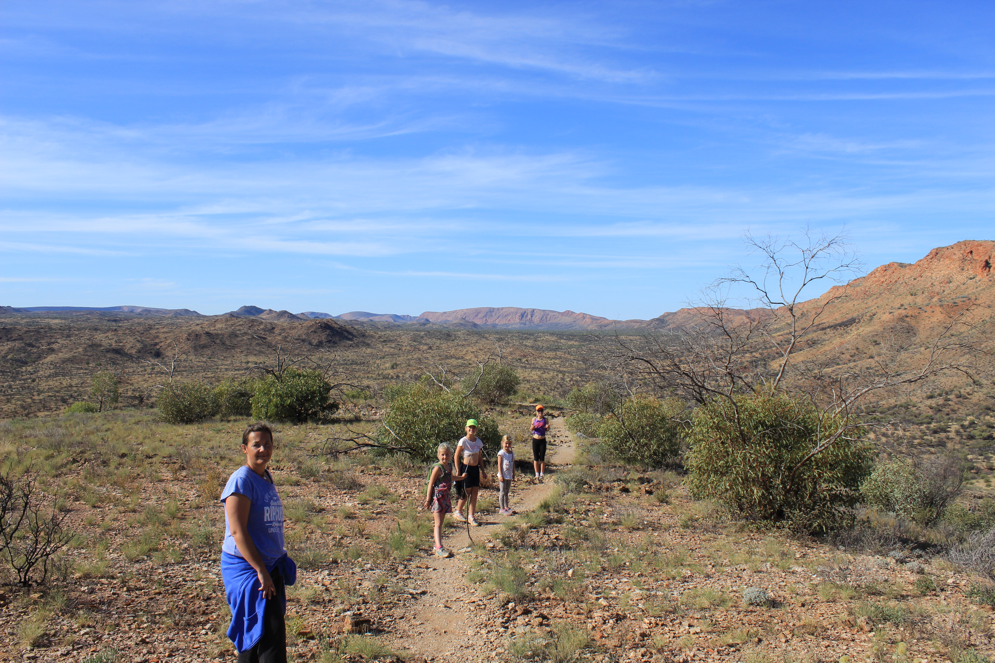 Our last destination for the week was back into Alice and then out east to the Trephina Gorge Nature Park. We had driven past this park a few weeks earlier but had run out of time for a visit so decided we had to come back for a few days. The campsite again had limited spots but we were able to find ourselves a great little patch of land with its own fire pit and not too far from the drop toilet. Trephina Gorge Nature Park is well known for its steep quartzite cliffs and River Red Gum lined watercourses. Within this park there are two gorges that divide the East Macdonnell range, Trephina, with amazing panoramic views and sandy creekbed, and the John Hayes Rock Hole with steep, narrow rock walls. The park offers quite a few walks for all fitness levels and the info boards are well set out with great information. They even do a ranger talk here on a Thursday evening, the day we leave. In the morning we set off on the short Trephina Gorge walk, straight up the sloping slabs of rock to look down at the sandy dry gorge, the views and scenery were amazing, the colors spectacular!!! The walk took us back down into the far end of the gorge where we sat in the morning sun and Nik and all the kids started a lifesaving ‘flags’ competition. After much debate about handicaps for the older kids they ended up enjoying quite a few rounds with the victory honors going to Jess, Zoe and Damon. With tummys rumbling we decided to head back to camp for some lunch then back out again to do the Panarama walk in the afternoon. This walk had an initial heart starter climb to begin with but ended up giving us some amazing 360 degree views of the gorges and surrounding ranges.
