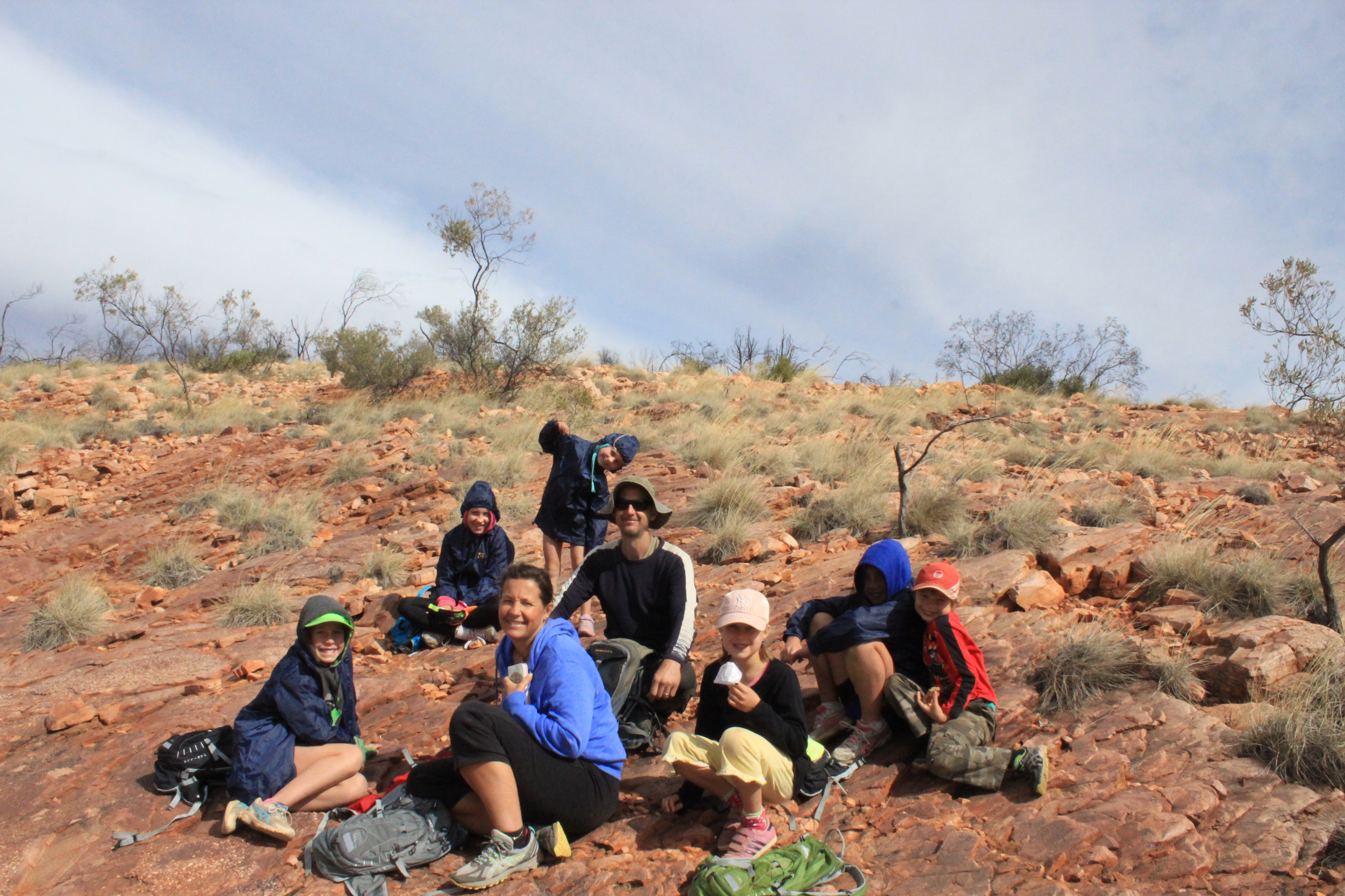 The next day after we had done our little warm up walks we decided to tackle the Ridgetop Trail which took us 9km one way into John Hayes Rockhole, Simon and Nik organised to leave one of our cars at the rockhole carpark for the drive home. We left about 10ish and proceeded a steady ascent up the rocks to the top of the ridgeline some 5km later………. With the promise of lunch when we arrived at the lookout the kids didn’t complain too much. The walk and views were, once again, spectacular even with clouds and an overcast day, we even managed to score some mobile coverage, something we had been without for a few days. It was hard to concentrate with our phones making noises like the pokies. With less than 4km to go we started our descent having a somewhat nervous moment when we noticed the track took us very close to going over a cliff…….until we realised that we had veered off the track a few metres before. After we righted our course the descent was tough going down some steep tracks and rocks, especially as we tried to dodge the spinifex grass and ant population. We were spoilt with one last look out at the John Hayes Rockpool, amazing how the masses of water over time can be responsible for carving out these gorges, before we arrived at the carpark for the short drive home. Needless to say that night we were all early to bed.