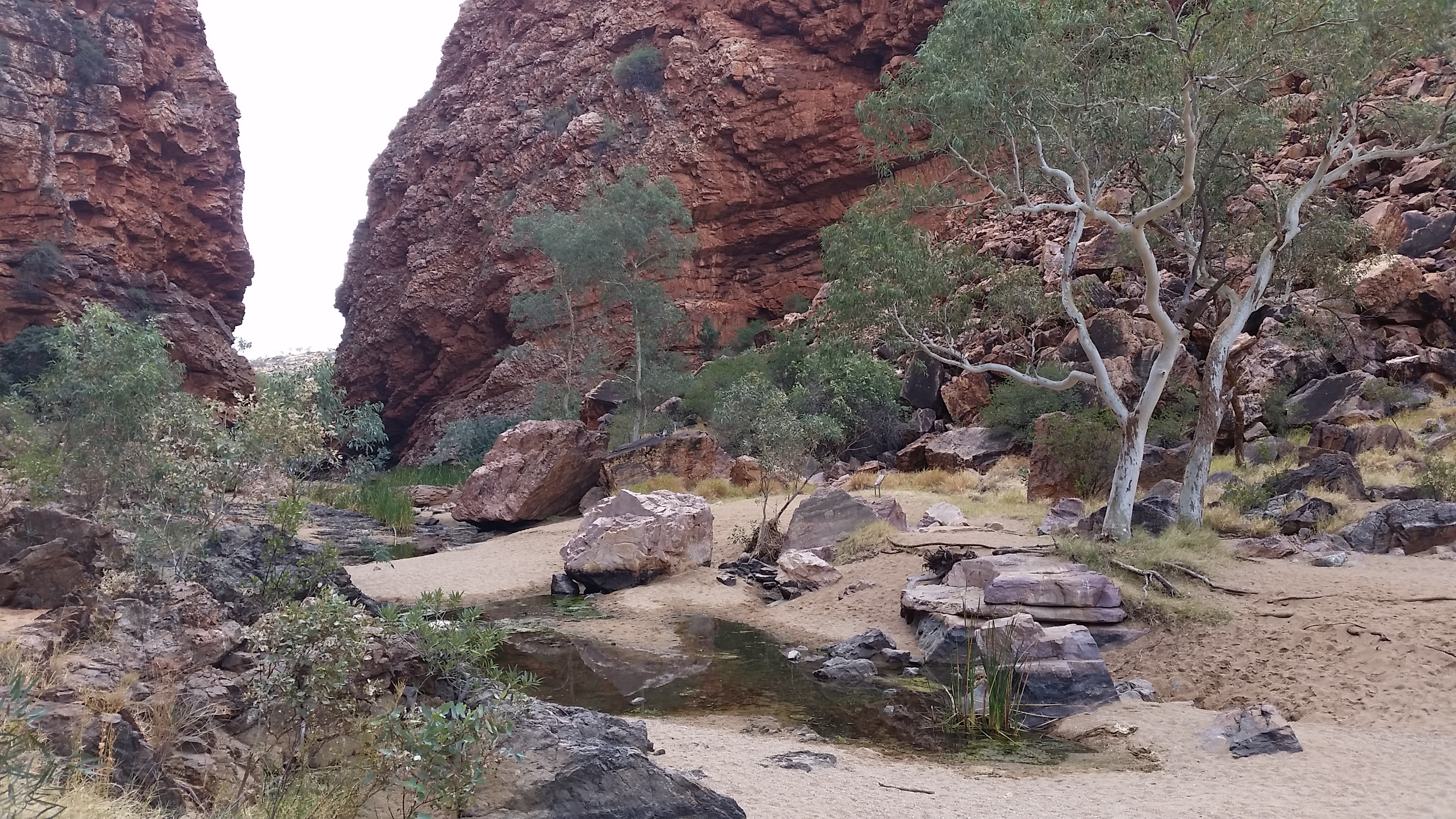 Part one of all this reorganising was in preparation for a visit from my Mum, who was escaping the nasty Winter back in Melbourne and joining us for our next fortnight adventure, The Red Centre Way. Mum’s flight from Melbourne arrived in Alice Springs about lunchtime on the Saturday, it was a beautiful sunny day much like it had been EVERYDAY for the last 6 weeks. Yet less than 2 hours later we had thunderstorms, hail, rain and freezing weather………….. This continued on well into the night interrupting the internet as we kept trying to book flights home for her on the Sunday morning……….meanwhile in Melbourne they had a lovely sunny Winters day. Luckily for us (and especially mother) this was a freak once off and whilst we awoke to a misty damp Sunday morning the sun did come out and we went and enjoyed a Big 4 free pancake breakfast, all you can eat.