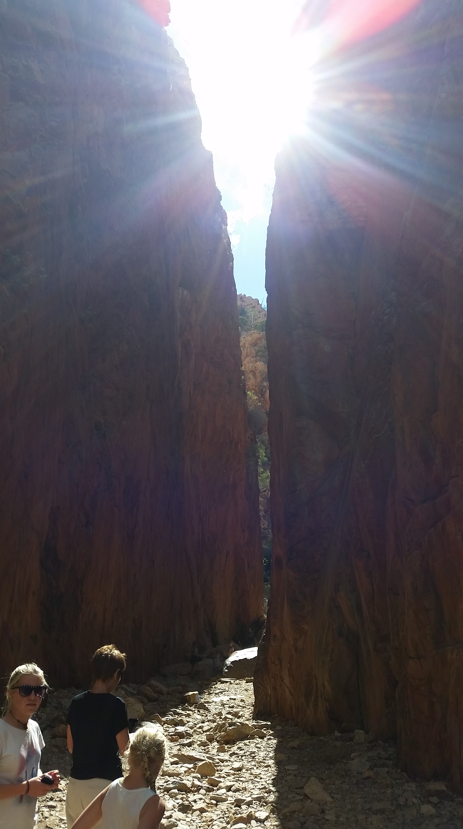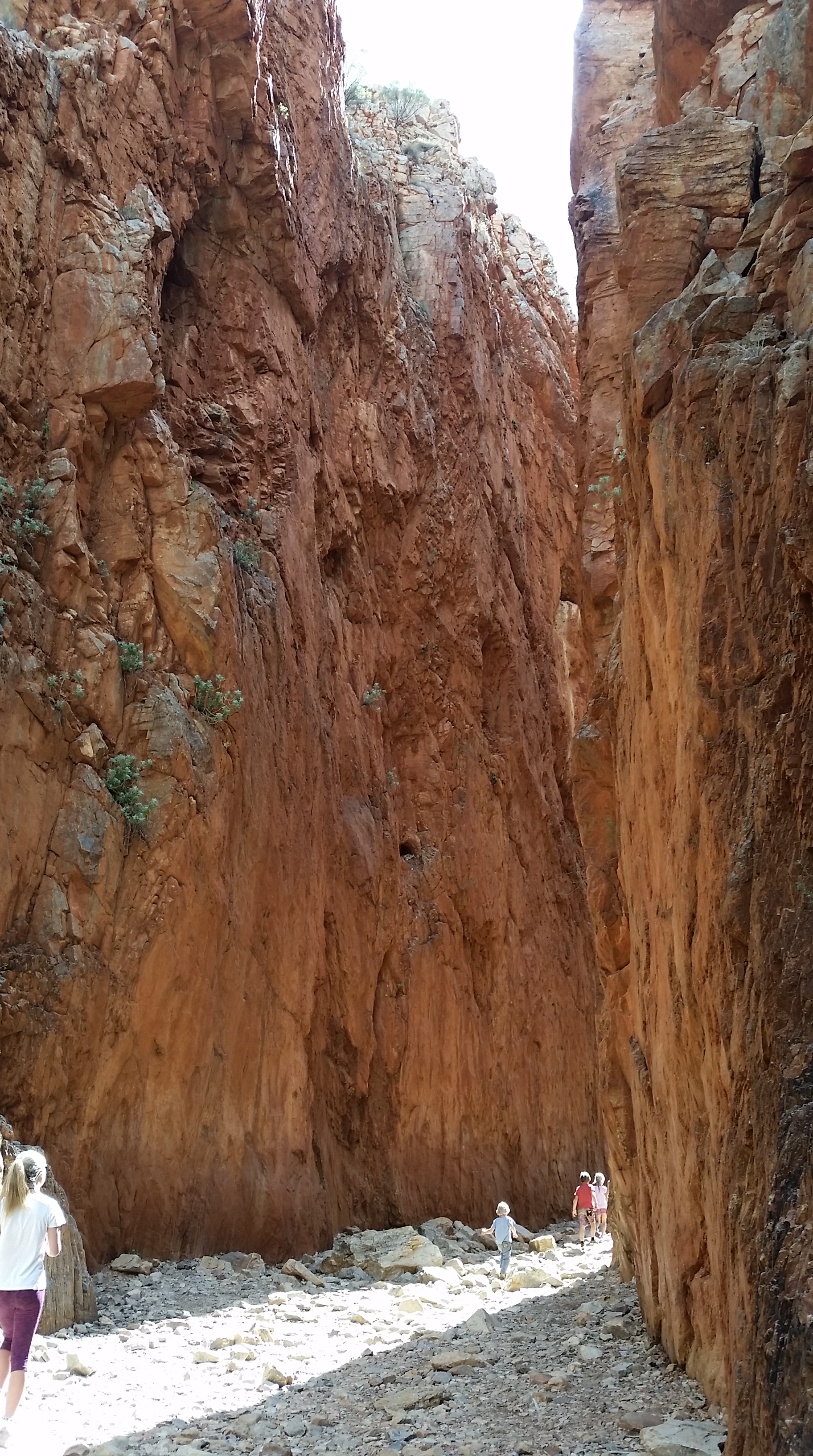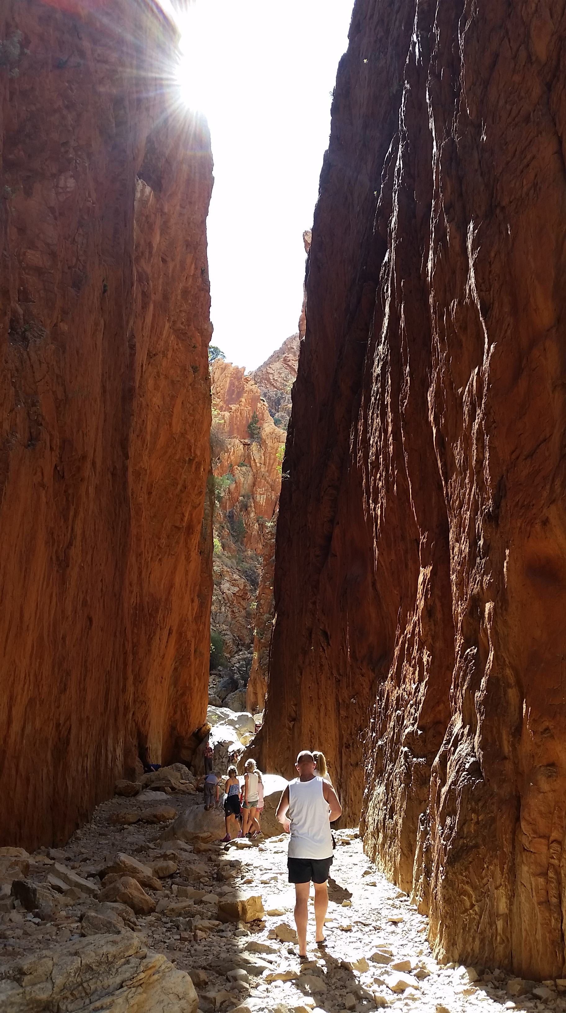 Next stop was Standley Chasm, a bit further west along the Red Centre Way. Standley Chasm is actually privately owned by an aboriginal community and is jointly run by the community and the Northern Territory Parks Department. There is a café with real coffee, winning, and the walk costs about $25 per family. Unfortunately there is no guided walks available so we had our lunch and then headed off by ourselves. The walk to the Chasm is about 1.2km along the river bed along a combination of manmade and natural pathways past huge Red River Gums and Cycad type palms, reaching the rich gorgeous stained red cliffs of the Chasm. The colors are amazing, particularly with the sun shining directly above the chasm and shining into the gap, the photos once again just don’t do it justice!!!! It was difficult to get a photo without people in it, as being lunchtime the crowds were starting to roll on in.