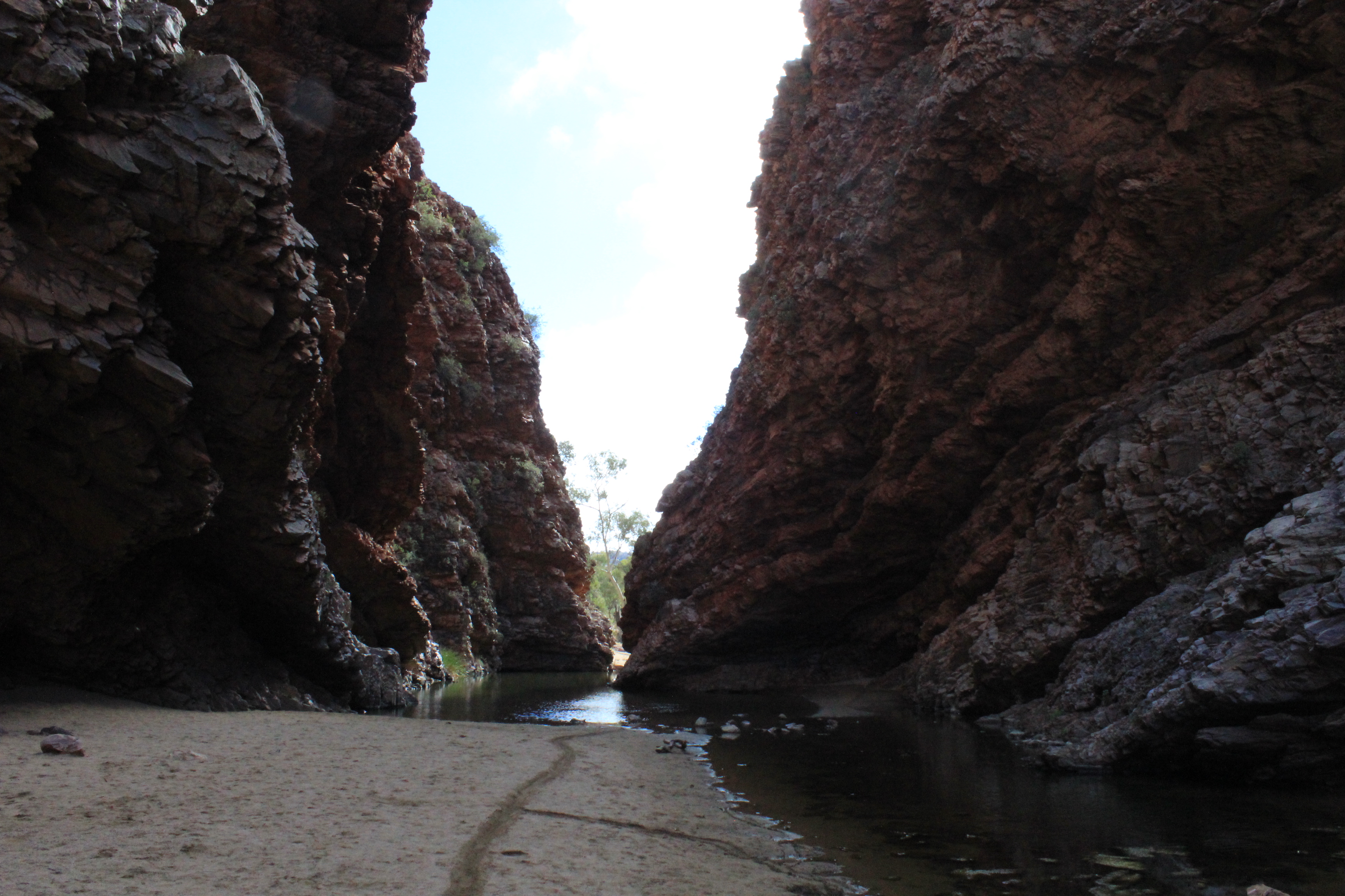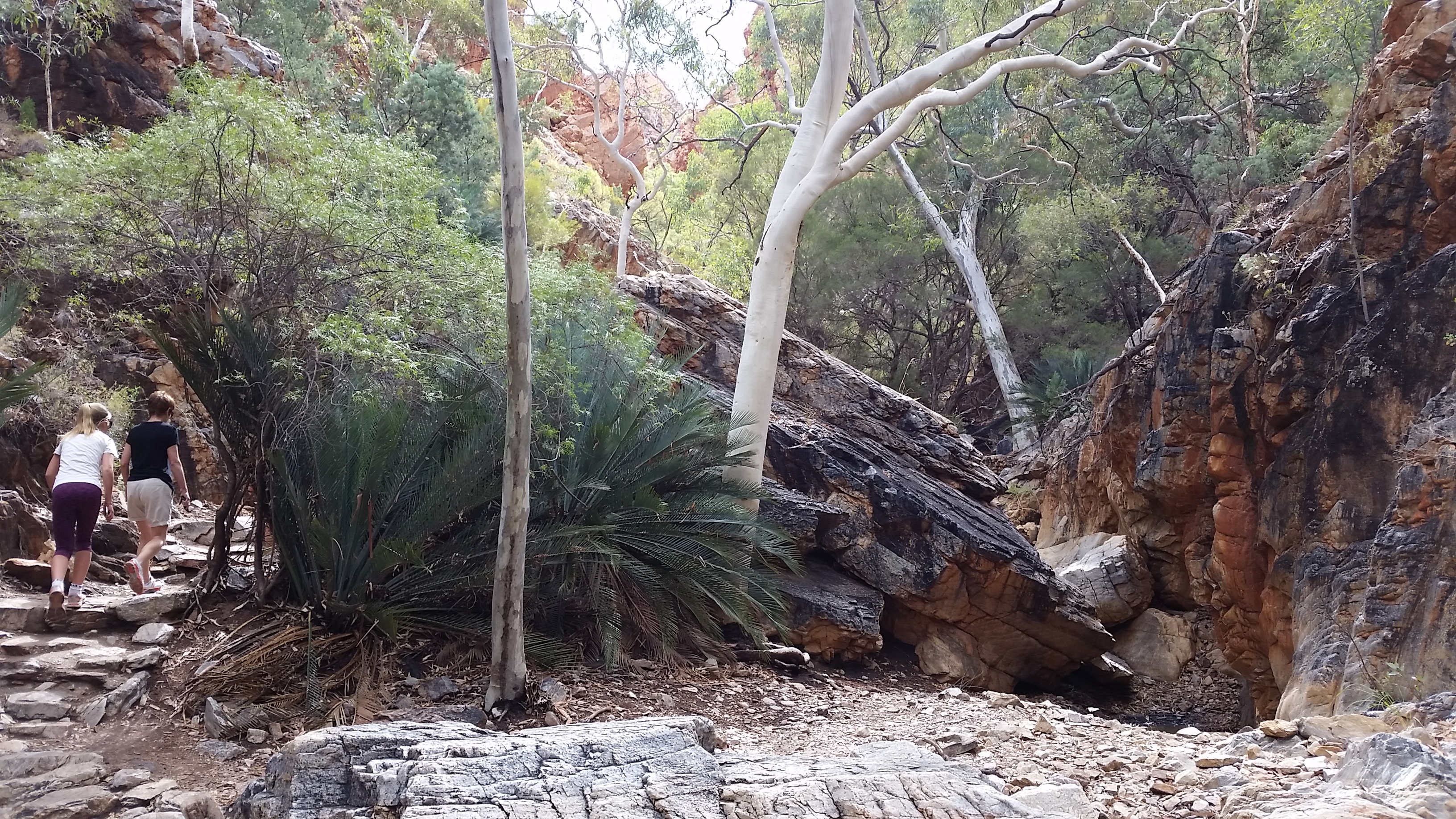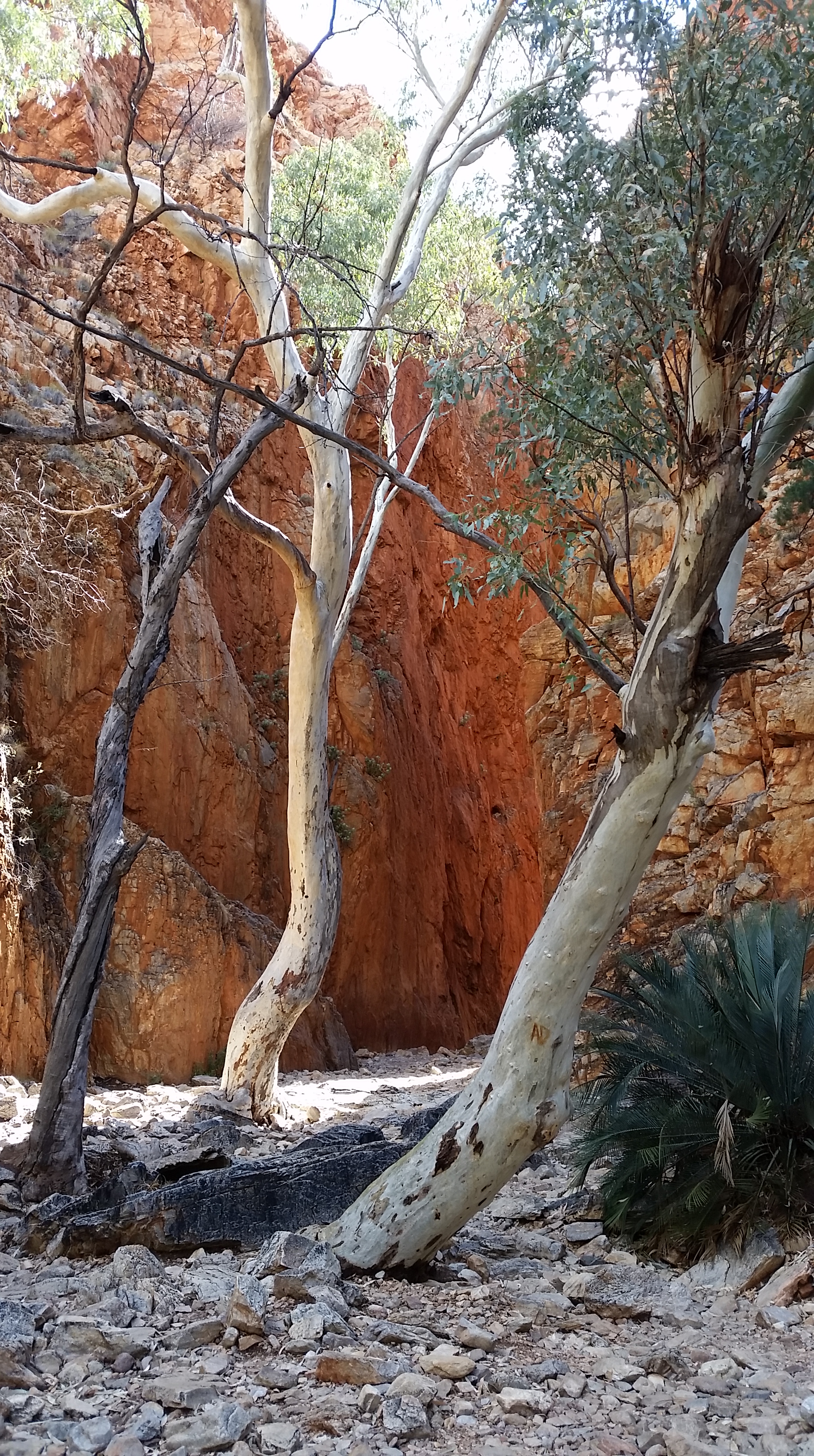 Next stop was Standley Chasm, a bit further west along the Red Centre Way. Standley Chasm is actually privately owned by an aboriginal community and is jointly run by the community and the Northern Territory Parks Department. There is a café with real coffee, winning, and the walk costs about $25 per family. Unfortunately there is no guided walks available so we had our lunch and then headed off by ourselves. The walk to the Chasm is about 1.2km along the river bed along a combination of manmade and natural pathways past huge Red River Gums and Cycad type palms, reaching the rich gorgeous stained red cliffs of the Chasm. The colors are amazing, particularly with the sun shining directly above the chasm and shining into the gap, the photos once again just don’t do it justice!!!! It was difficult to get a photo without people in it, as being lunchtime the crowds were starting to roll on in.