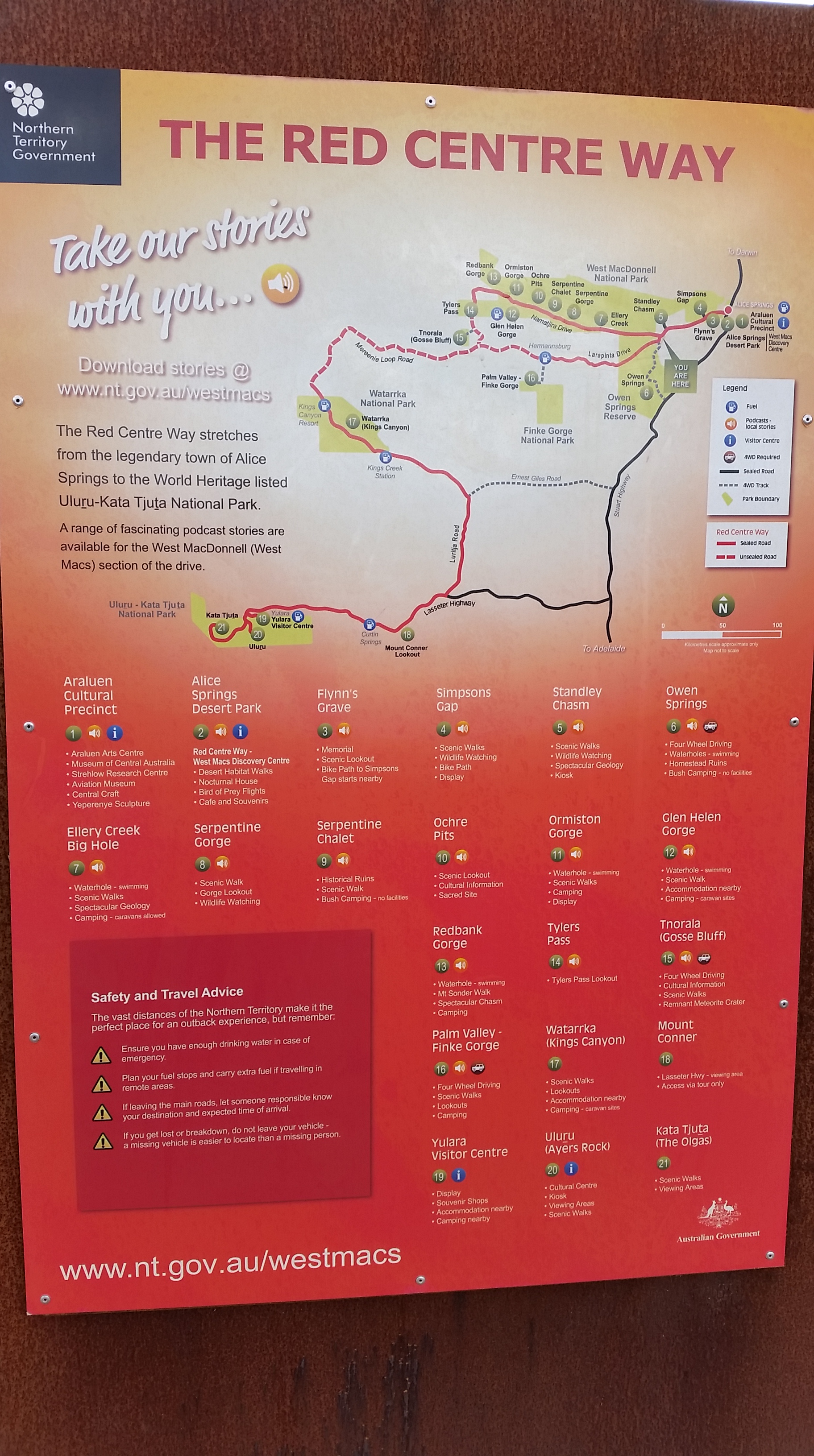 On the Sunday afternoon Mum, the girls and I went off to do run a few errands and then went to the botanical gardens for afternoon tea. Unfortunately the café had run out of slices and ice cream and the girls could only have a can of lemonade….disappointing. We also walked around the gardens and found a geocache and spotted a Black footed Rock Wallaby. We then headed to the supermarket for some fruit and vege supplies in preparation for our 10 day adventure through the Red Centre, we were all very excited!!!! The Red Centre Way begins in Alice Springs and heads west along Larapinta Drive, Namatjira Drive through the West MacDonnell Ranges (referred to as Tjoritja by its traditional owners), Mereenie Loop Road through to Watarrka National Park (Kings Canyon) and finishes down in Uluru and Kata Juta.