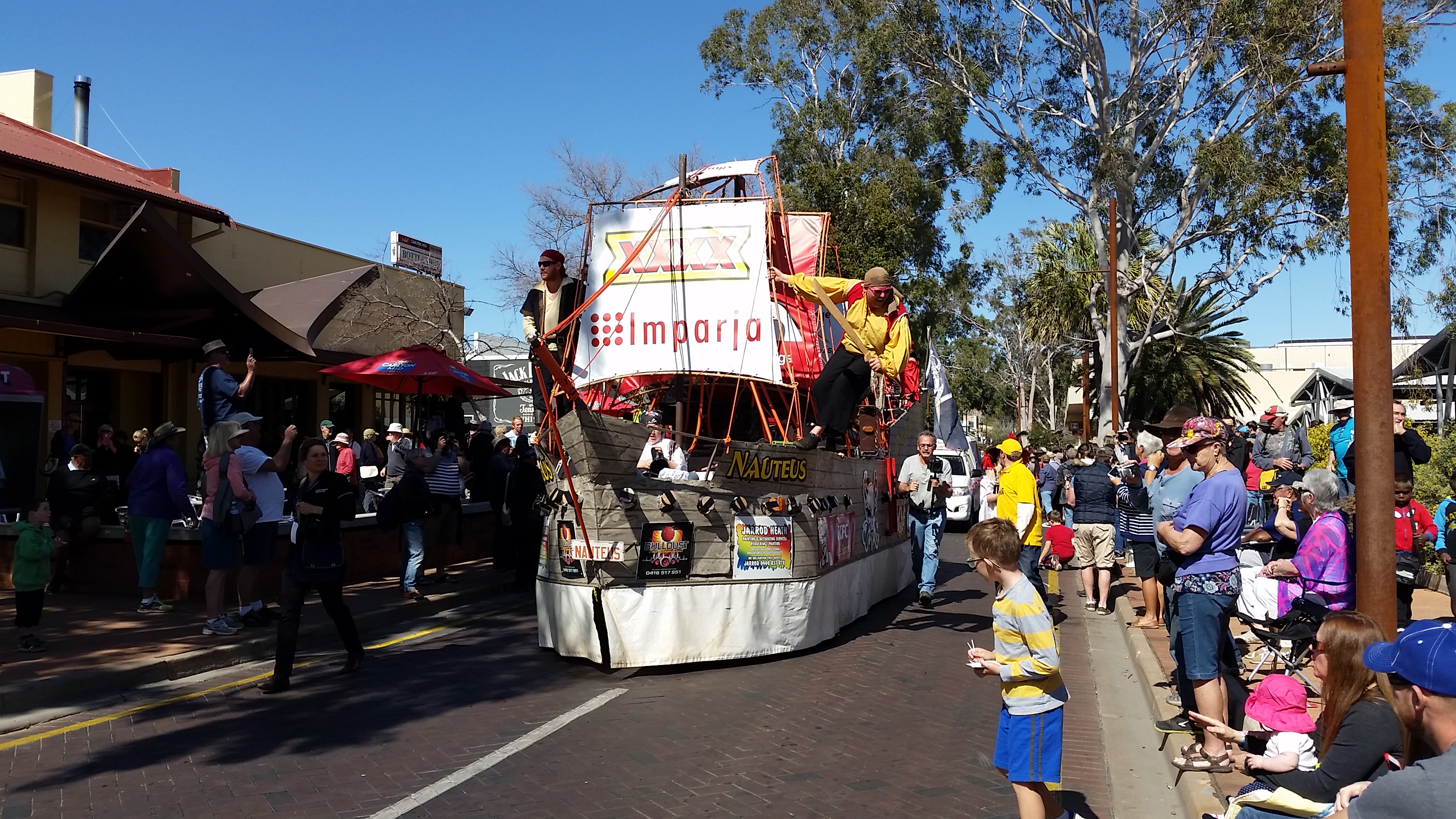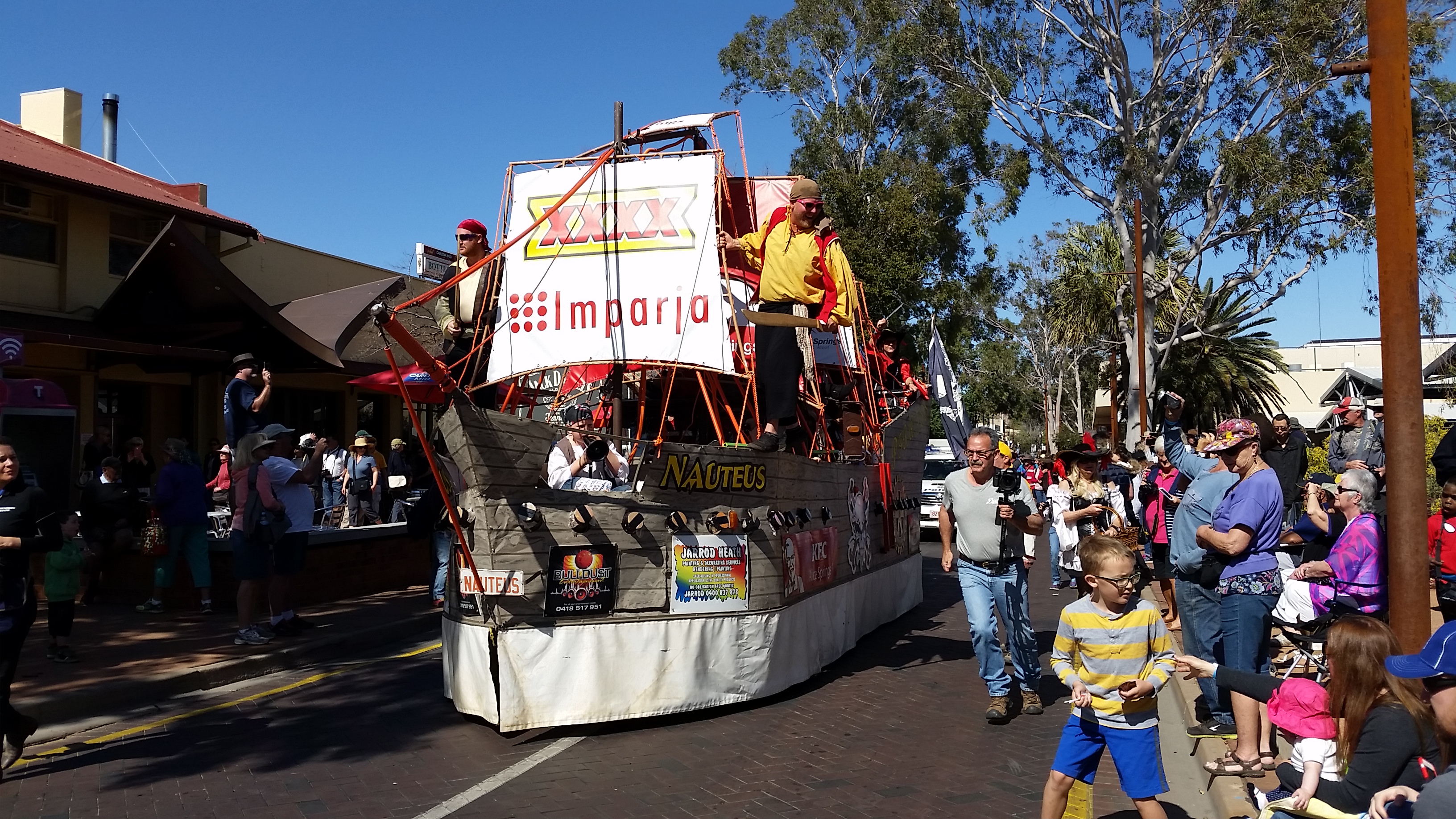 The day begins with a parade down Todd Mall with many colourful floats and cars and, from what we gathered at the parade, there are 3 main boats involved, the Vikings, the Pirates and the Navy. The 3 big boats are powered by what we thought and assumed were tractor/ cars under the boat design. The parade was very loud and colourful with lots of toing and froing of heckling from each of the main boats.