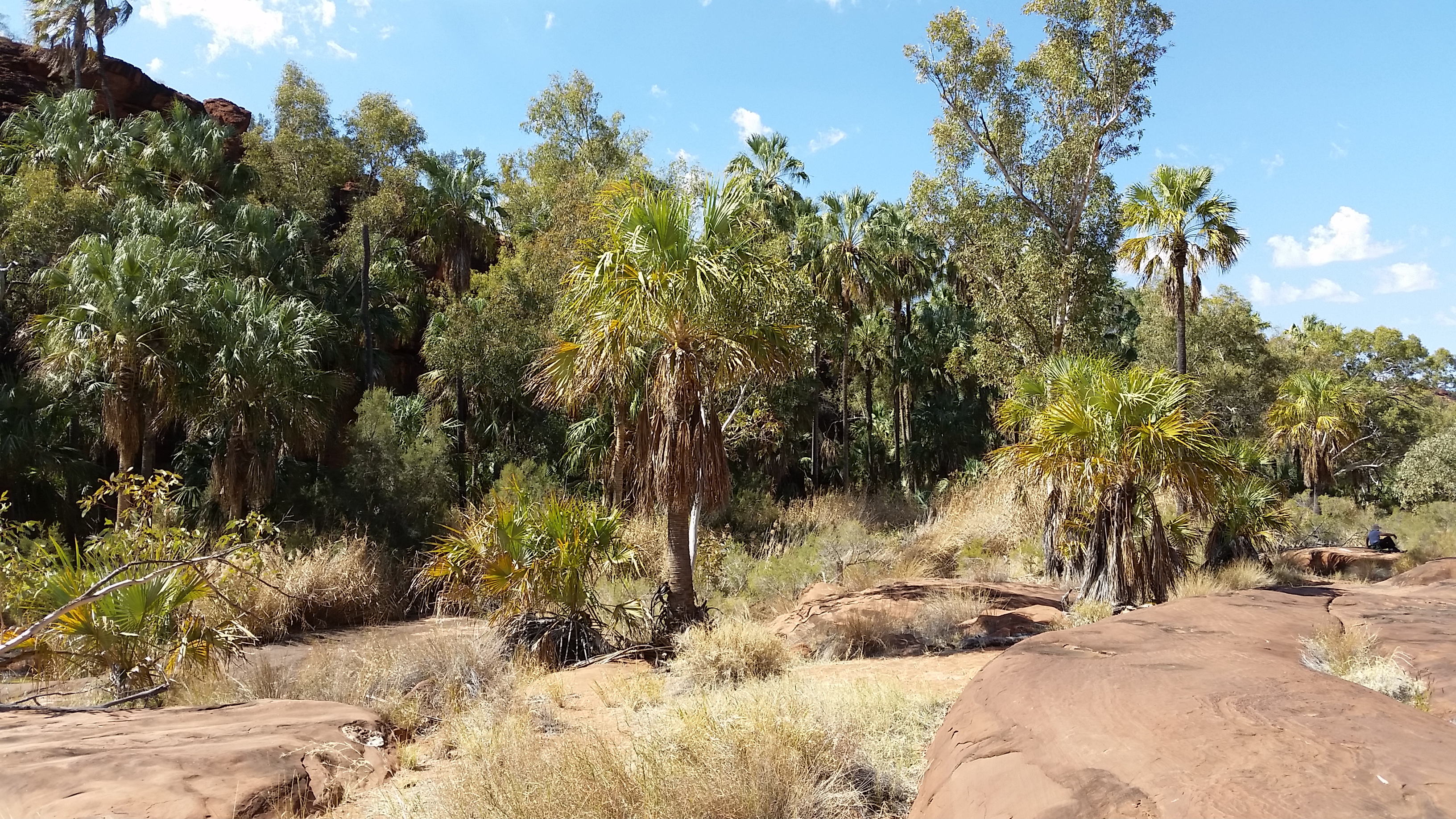 Next stop was Finke Gorge National Park, home of the infamous Palm Valley, which inturn is home to the more infamous rare species of Red Cabbage Palm, the only palm within Central Australia, with it being 1000km’s from its closest relative. After an easy 10km dirt road we stopped along the valley at the Kalarranga Lookout, near the campground, and went for a walk around some pretty spectacular rock formations and found another geocache.