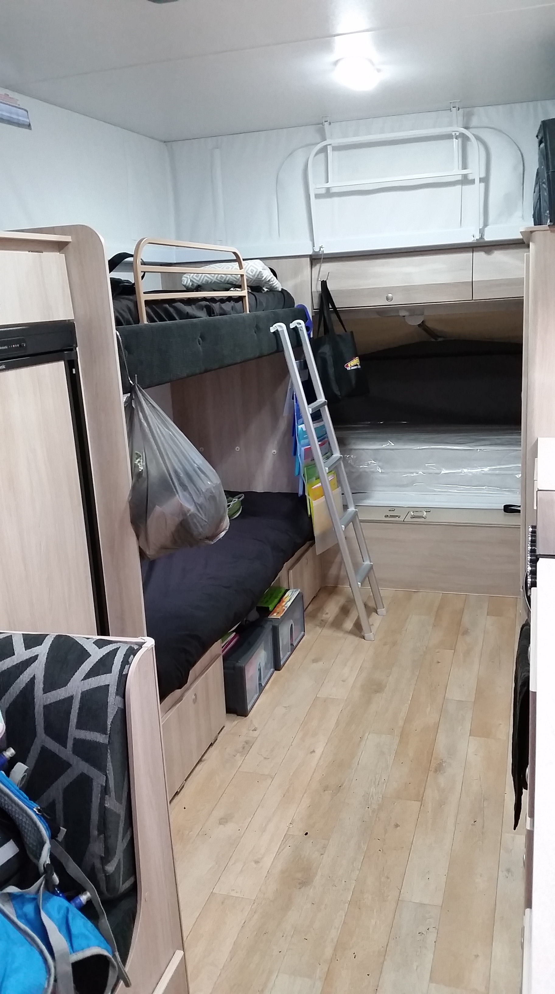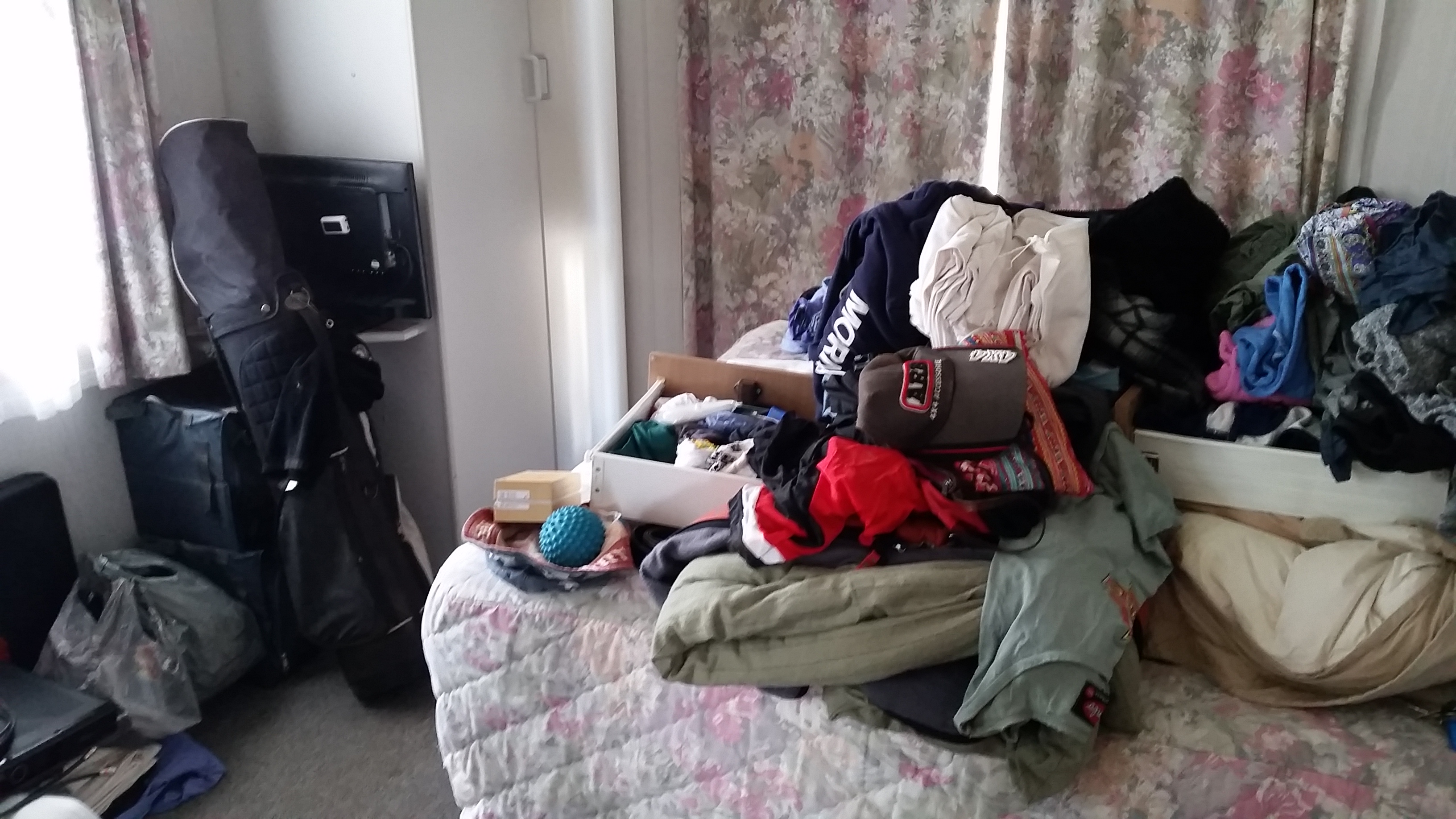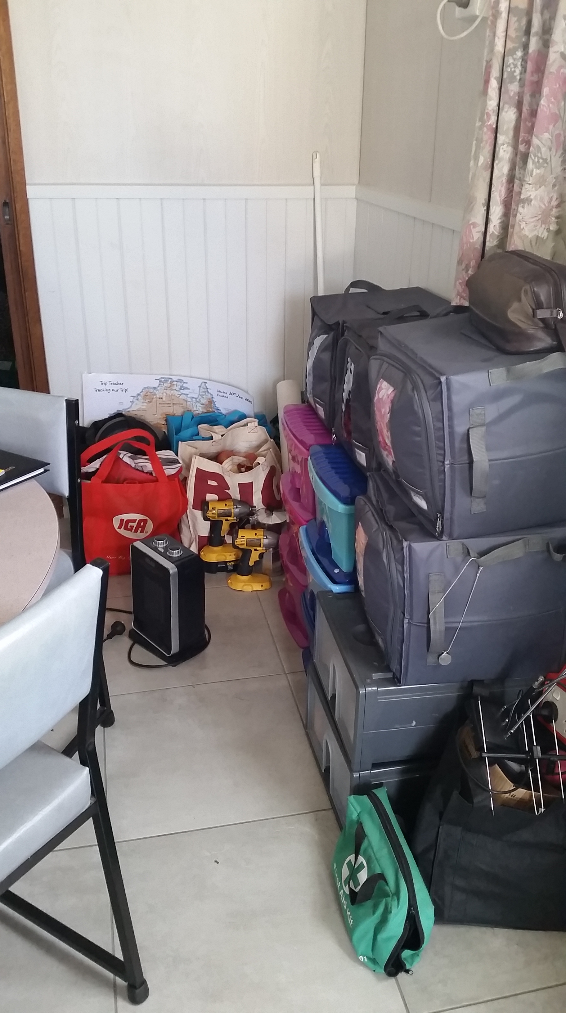 However, whilst the driving was complete, we still had a lot to do in a few short days!!! First off we had to unpack the WHOLE van into a 2 bedroom cabin we had hired for a few days. We were gobsmacked at the amount of stuff that actually came out of the van, and wondered as to just how and where we had managed to fit it in. Finally, after we had overflowed out onto the verandah and adjoining lawn, we were unpacked and then prayed that the park owners wouldn’t throw us out for turning the cabin into a junkyard and halfway house. Thankfully they were nice and understanding of our predicament (the living in a van and being homeless one….), but we were punished by the weather gods as it poured with rain for the next 48 hours…………. As Nik and I got stuck into sorting, cleaning and throwing out, the girls, without us realising, had completely unpacked ALL of their stuff into the cabins wardrobe provided in their little room of bunks, they had then set about decorating the room with posters and pictures all over the walls and doors……….looking at what they had done you would have thought we had settled in for the long haul.