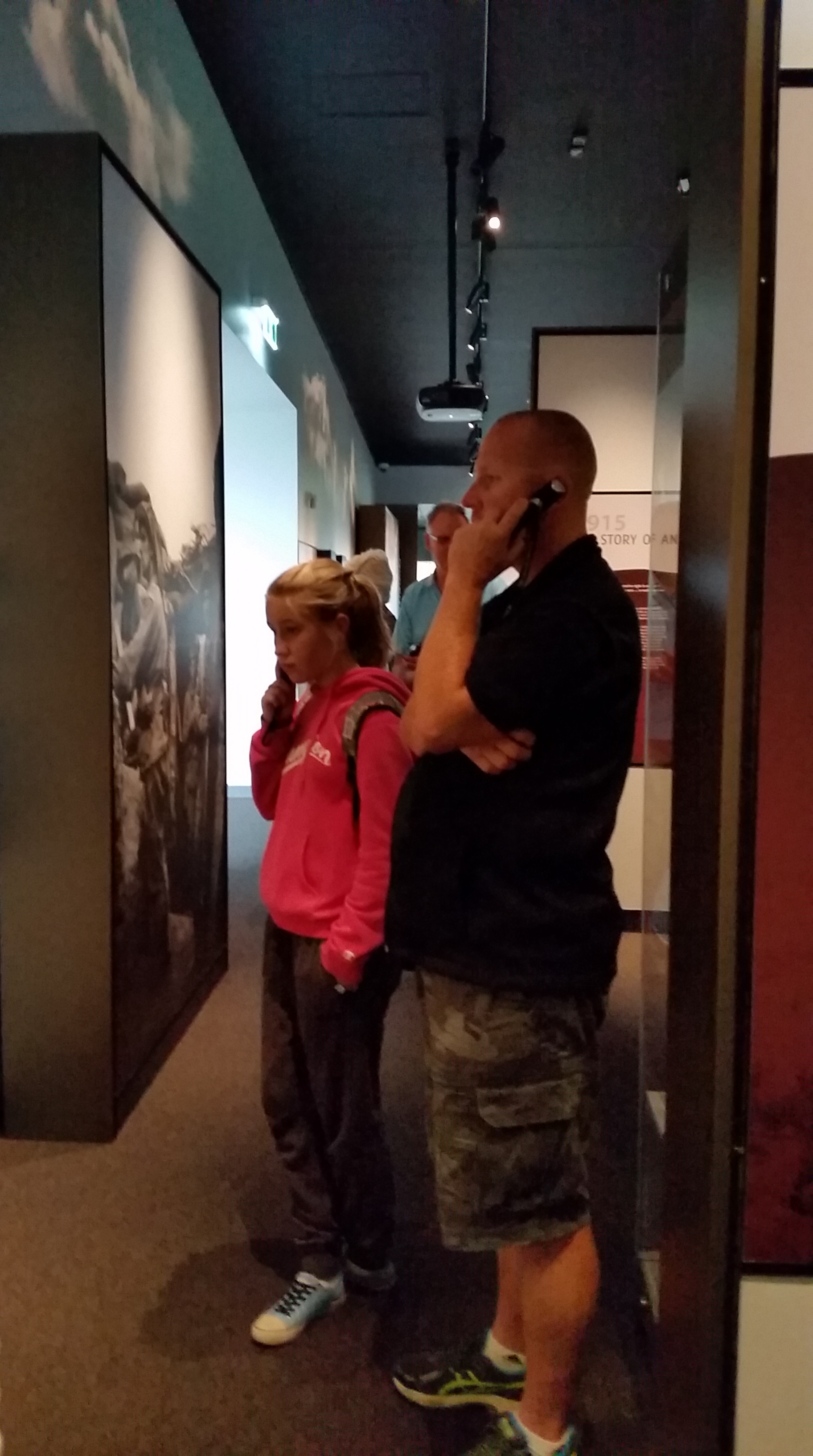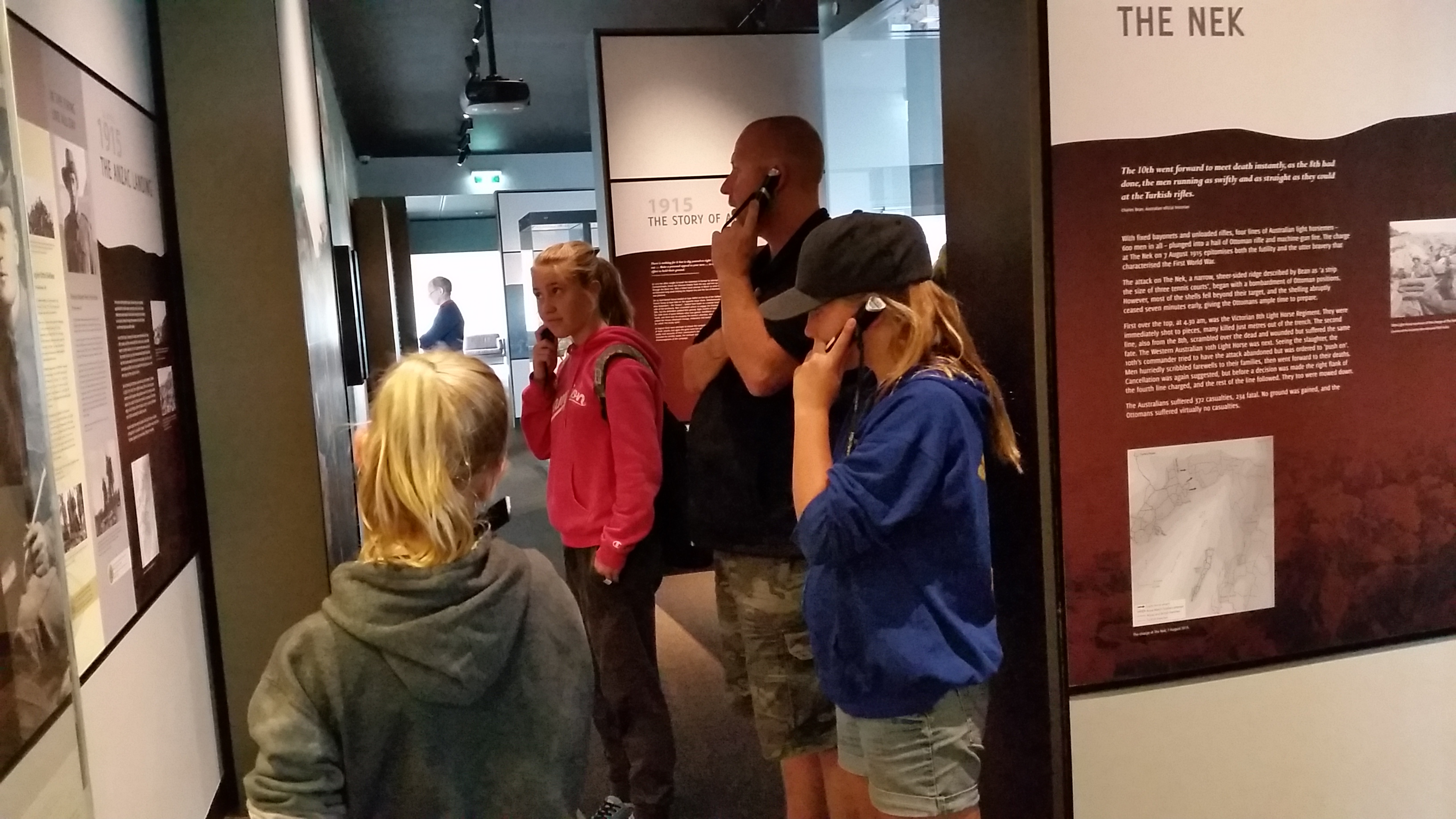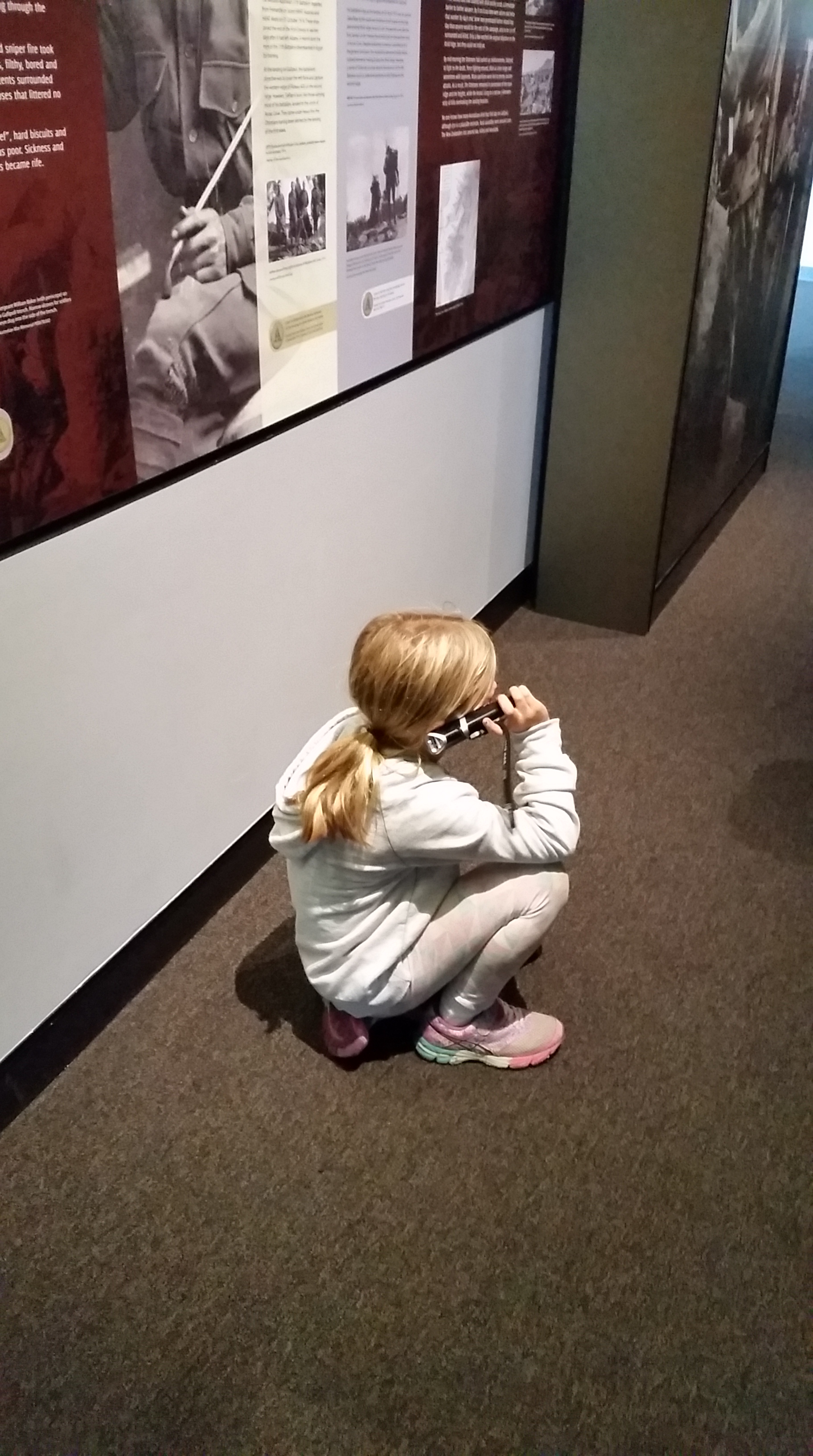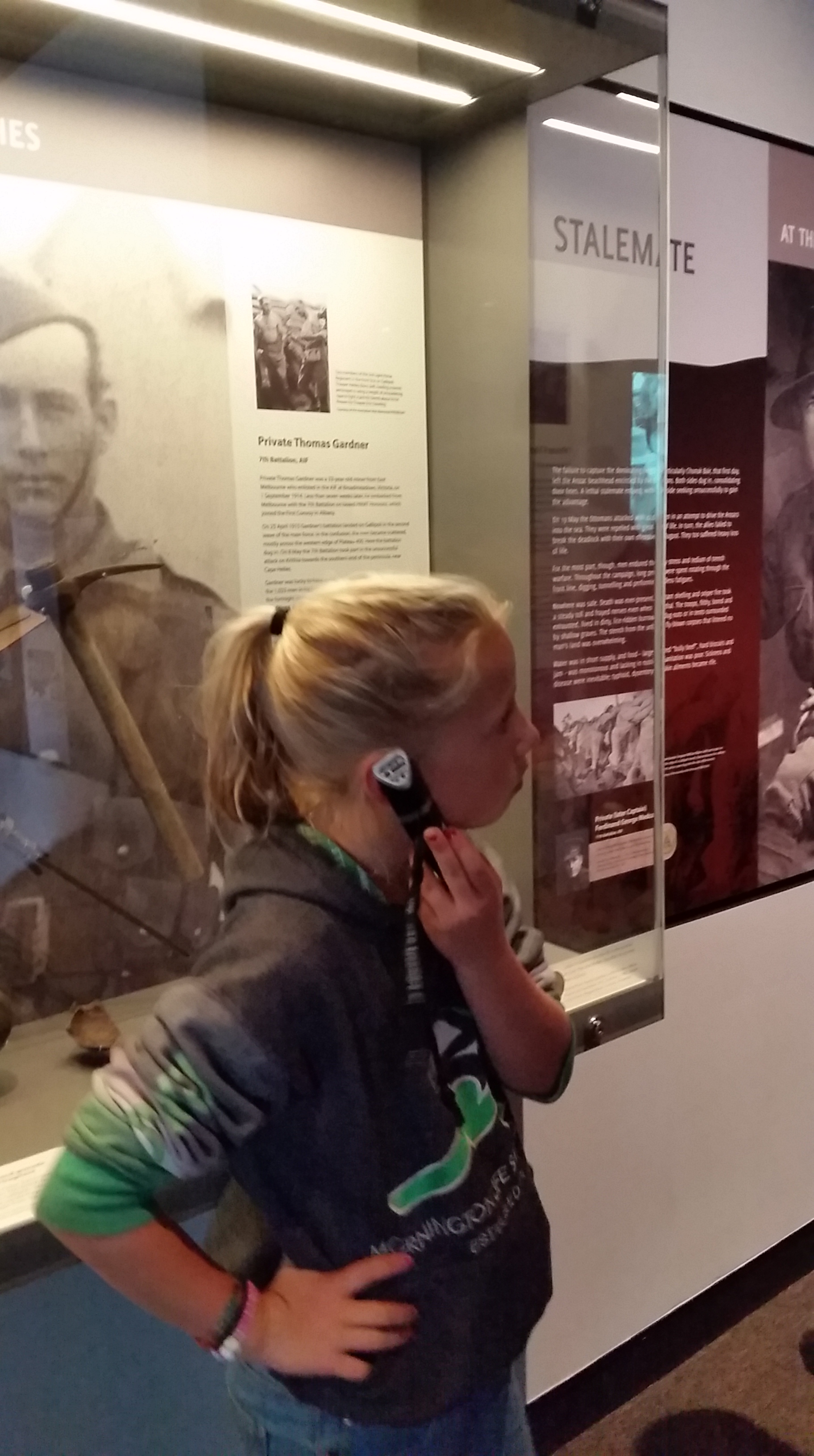 I think overall we spent about 2 hours in there, even Jess remained enthusiastic until at least the 90 minute mark. We began at the beginning, trying to figure out and explain to the kids all about the different allegiances between European countries and Great Britain, which led to WW1 and ultimately to Australia’s involvement. From there we learnt about the first and second convoy of ANZACS that were deployed from King George Sound, Albany, less than a kilometre from where we were standing, to the infamous landing at Anzac Cove, Gallipoli in 1915, onto the many battles of the Western Front and Egypt. We then learnt about the ‘armistice’ and what happened on the eleventh hour, of the eleventh day of the eleventh month and what the kids know as Remembrance Day. The last part of the tour wraps up with information about the huge deployment efforts and the many mental and emotional problems that the soldiers endured on their return home. Then to conclude the whole self guided tour you can place your card on the final screen and learn what become of your ANZAC, Jesse was lucky enough to have Charles Bean who survived the war and returned home to dedicate a large part of his life to the development of the Australian War Memorial in Canberra, whilst I had Bugler Otto Siefken, 11th Battalion, AIF, who sadly became a POW and perished during the war at the age of 24.