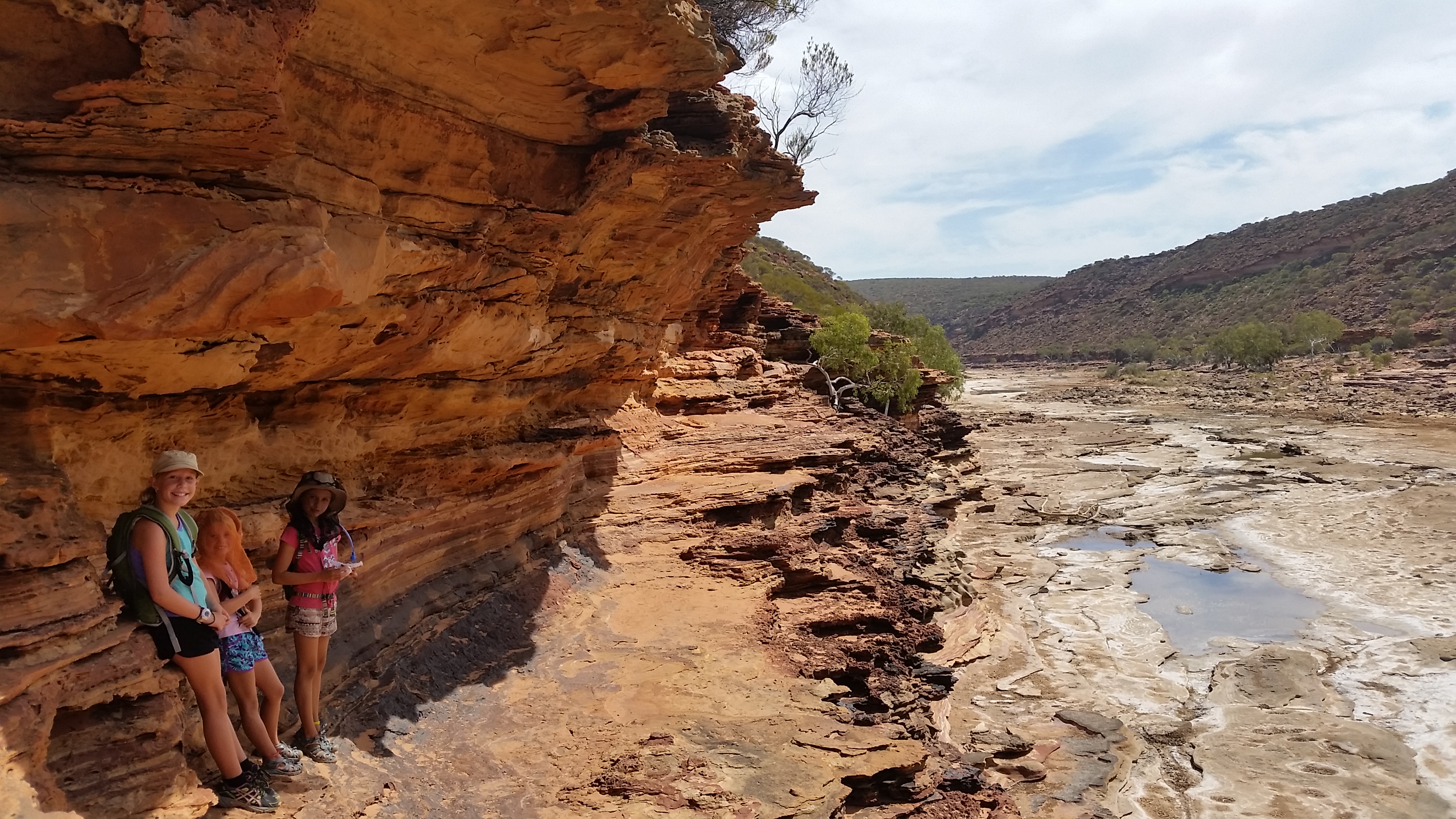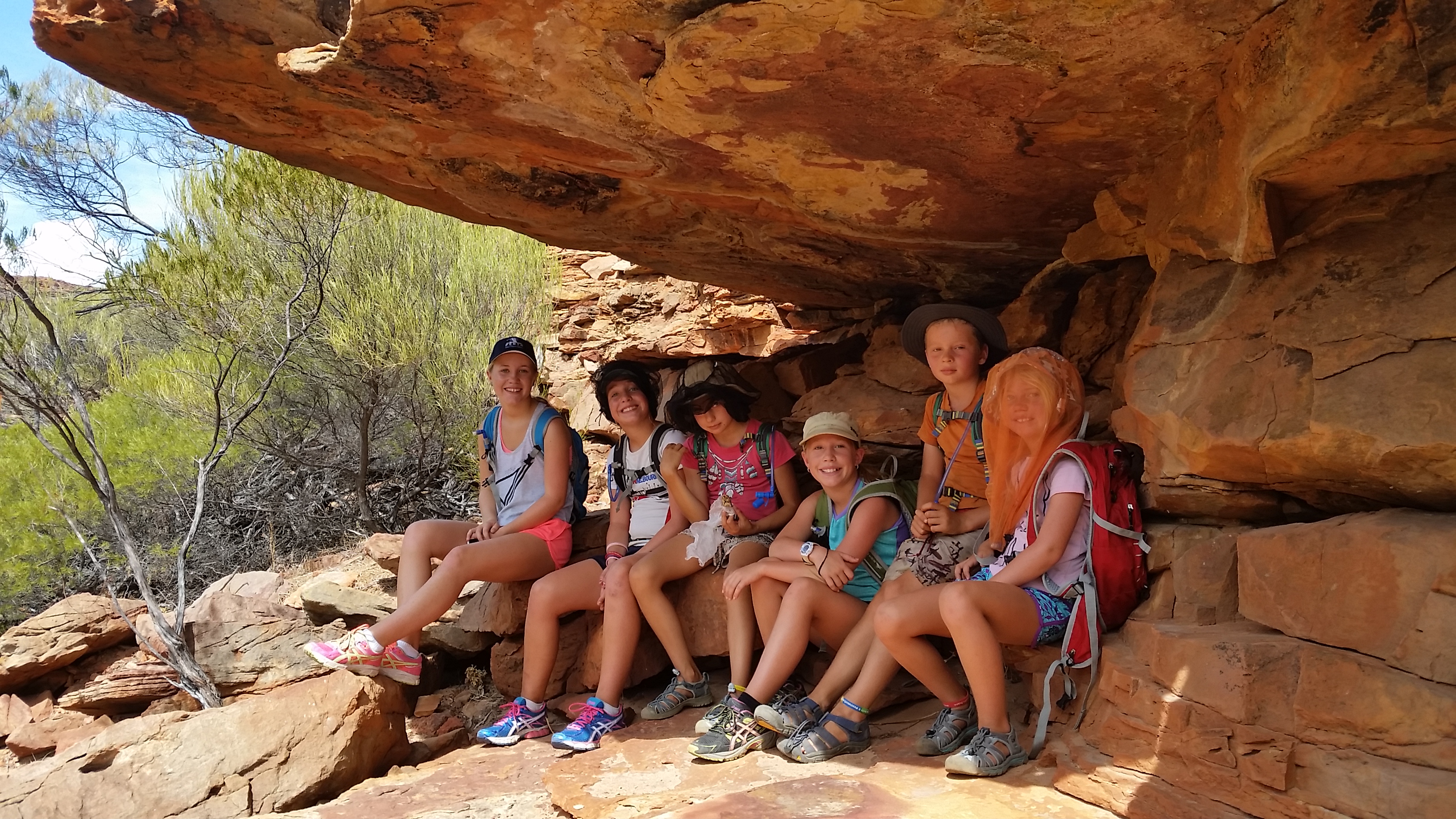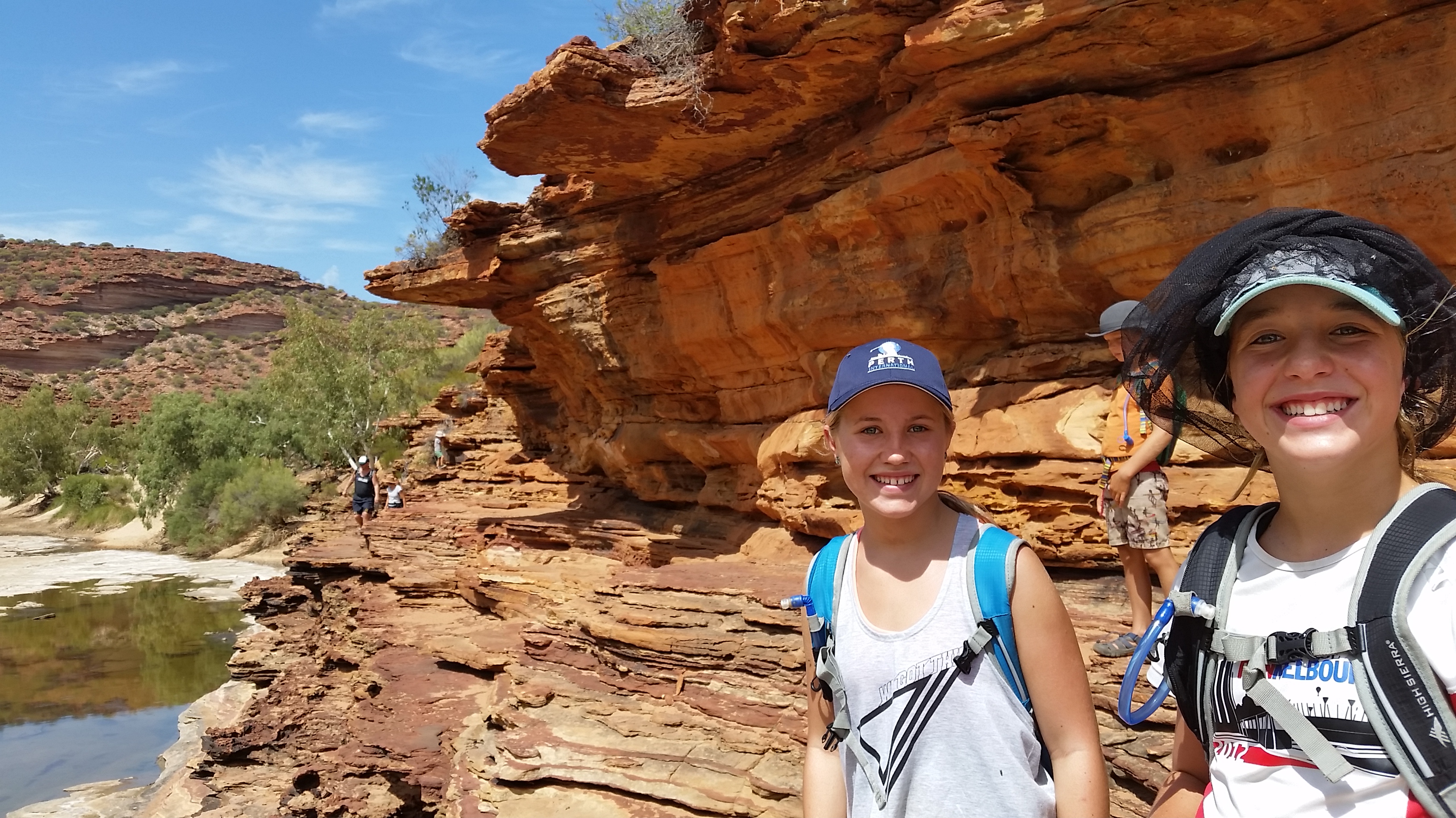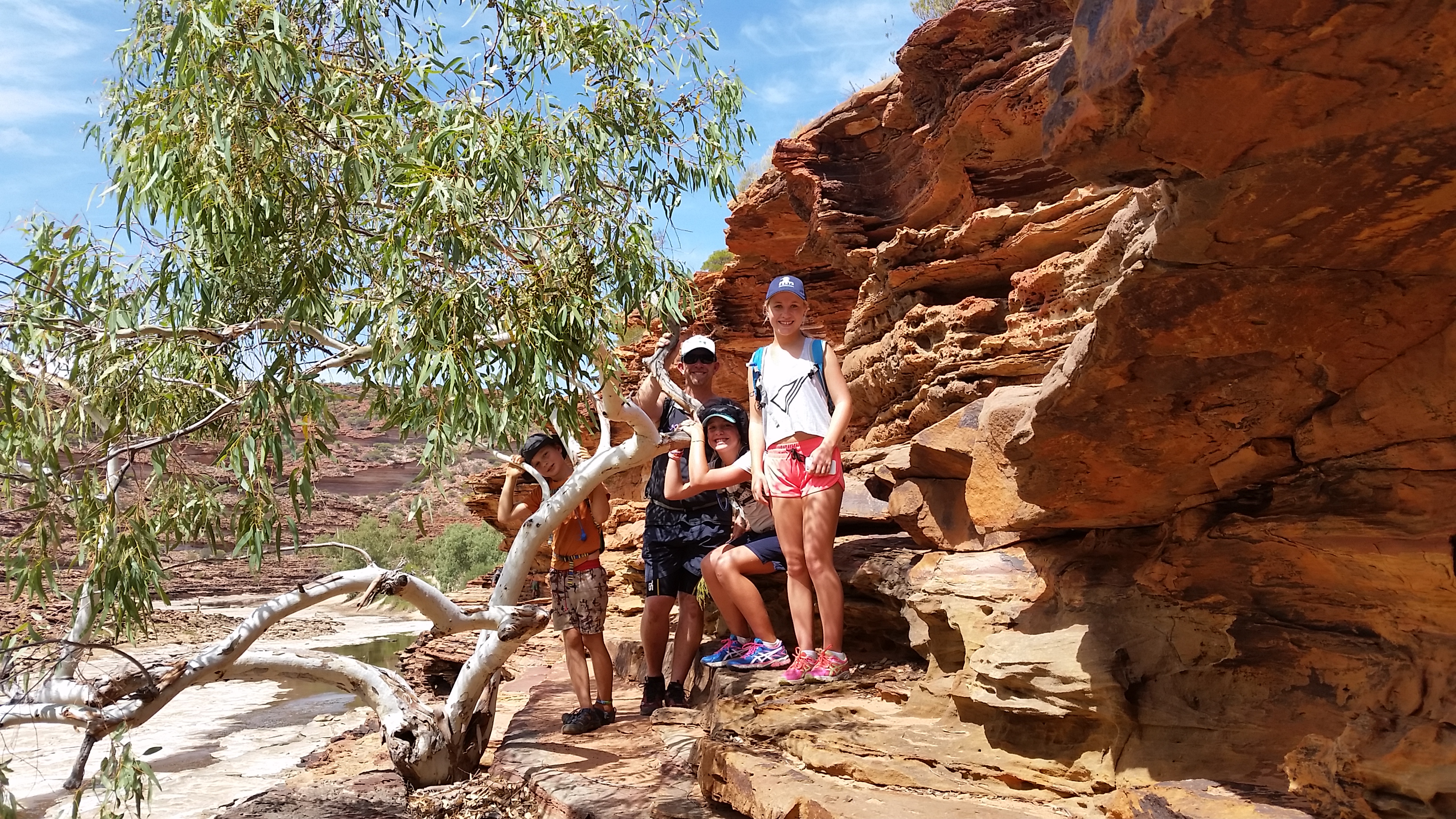 After about 4km we then started to descend into the river bed along the Murchison River where we stopped for a longer break and then we started to follow the riverbed along the river for the next gruelling, hot and draining 4kms. Lots of encouragement, high 5’s, support and of course, music was used as we made our way along the hot dry riverbed, however the kids were stars and didn’t complain at all, except when Jess got stung by a bee…. Finally we had the window and lookout in our sights, Nik and I looking at each other as we heard an Ambulance siren squealing, as we presumed it was taking a heat exhausted hiker to the hospital.  Even though we were organised with back packs, plenty of water, sunscreen and hats we were all certainly wilting and therefore could understand how easy it was to suffer. The mood once again turned jovial though as we climbed the last 500m up to the window, took an extra photo or two and then completed the very last 500m hard slog back to the car park, where we refilled and sculled water from our 10 litre container in the car.