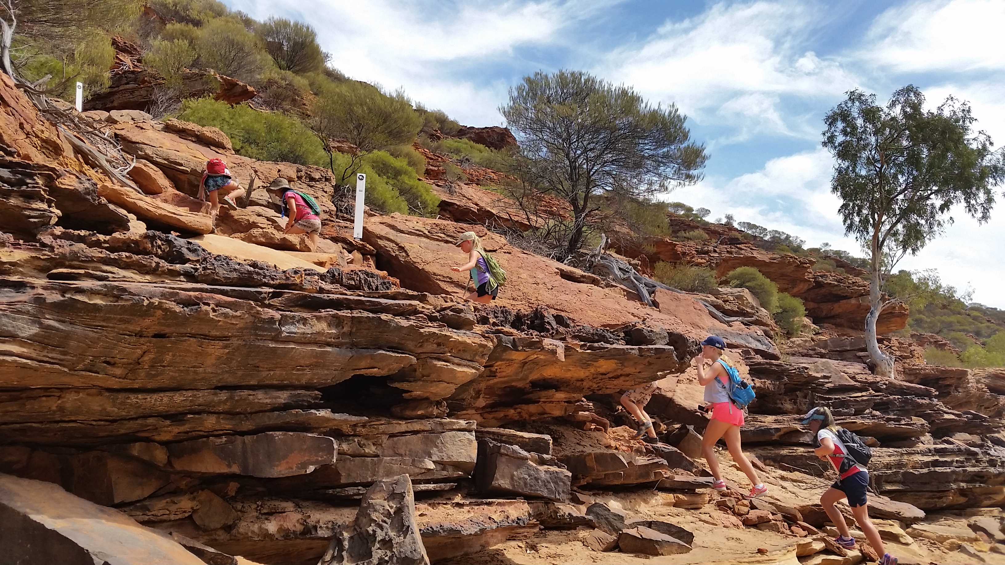 We had also packed our hiking backpacks as we were heading off to do the The Loop hike that takes you to Natures Window then beyond along the cliff tops, then down to banks following the Murchison River as it winds back onto itself, then we finish with a steep climb back up on Natures Window to finish. All up the brochures had said it was an 8km class 4 (difficult) hike, which we all mentally prepared ourselves for that previous night. However when we arrived the sign stated it was actually just over 9km, including the Natures Window hike……. So after we regrouped our thoughts we took a hesitant look at the sun peeking its way through the clouds trying to make its way out, deciding to get going so as to try and beat the heat of the day. The beginning of the walk along the cliffs was amazing, it had fantastic views and was a great natural hike, we also had plenty of photo opportunities as we were stopping for short rest intervals along the way due to the heat of the sun.