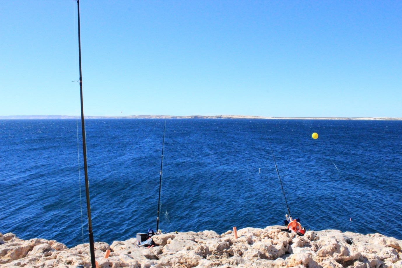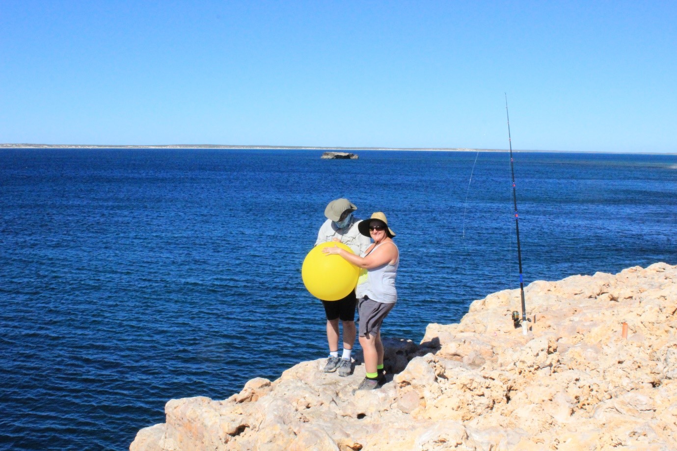 After we talked for a bit, sussing out each other’s stories and past and future destinations, we jumped back into the car and drove around to the area where all the hard core fishermen (and fisherwomen) come. My goodness, these people are dedicated and must love this sort of fishing. Firstly, they are camped high above the water, set back on the cliffs that are covered with dirt and sharp rocks, that make stable walking quite an effort. The wind around this part of the point (called The Oven/ Faultline) was ‘mild’ today according to a lovely couple we got talking to, generally they say it is blowing a gale night and day, which to me sounds like rather unpleasant conditions for camping in a tent or camper trailer. We sat and chatted with this couple for a while and watched and asked many questions while they fished and showed us how the whole ‘balloon fishing ‘concept worked. Once again our perceived ideas and thoughts were way off, we assumed the balloons helped the fisherman determine if they had caught something way down in the water, however this is not the case. The helium filled balloon is in fact, used to float the lure out to certain parts of the water, this actually requires quite a bit of skill by the fisherman, to where a ‘bait bomb’ is located (a huge school of fish that the tuna have herded together and then herded to the surface of the water) then as the balloon floats around in the air the lure bobs in and out for the water, looking like part of the bait bomb. Then as the bigger fish like tuna, mackeral and even shark, head in for a feed, they actually hook onto the line, it is at this stage that the reaction time and strength of the fisherman, or the anchor and strap that they are secured to on the rocks comes into play. Apparently quite a few fishermen have gone over the cliff (about a 20 metre drop) as they haven’t been quick enough to clip themselves onto the secure strap and there is no way in hell they are going to lose their $500 fishing rig. Thankfully the drop is not too big (compared to the Zuytdorp Cliffs on the western side) and dangerous and if the swell is not too bad they can safely pull themselves back out of the water and begin the long arduous climb back up the rocks to the cliff top.