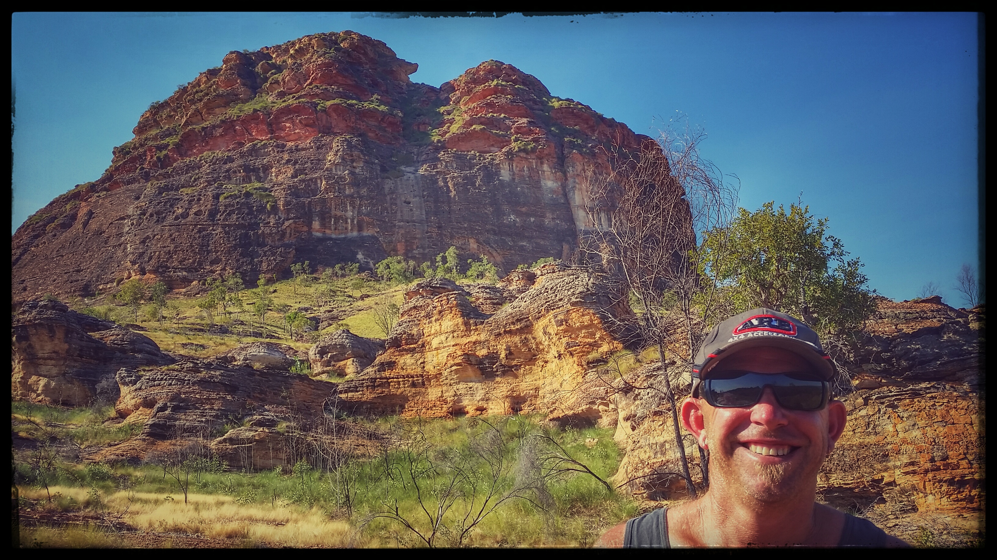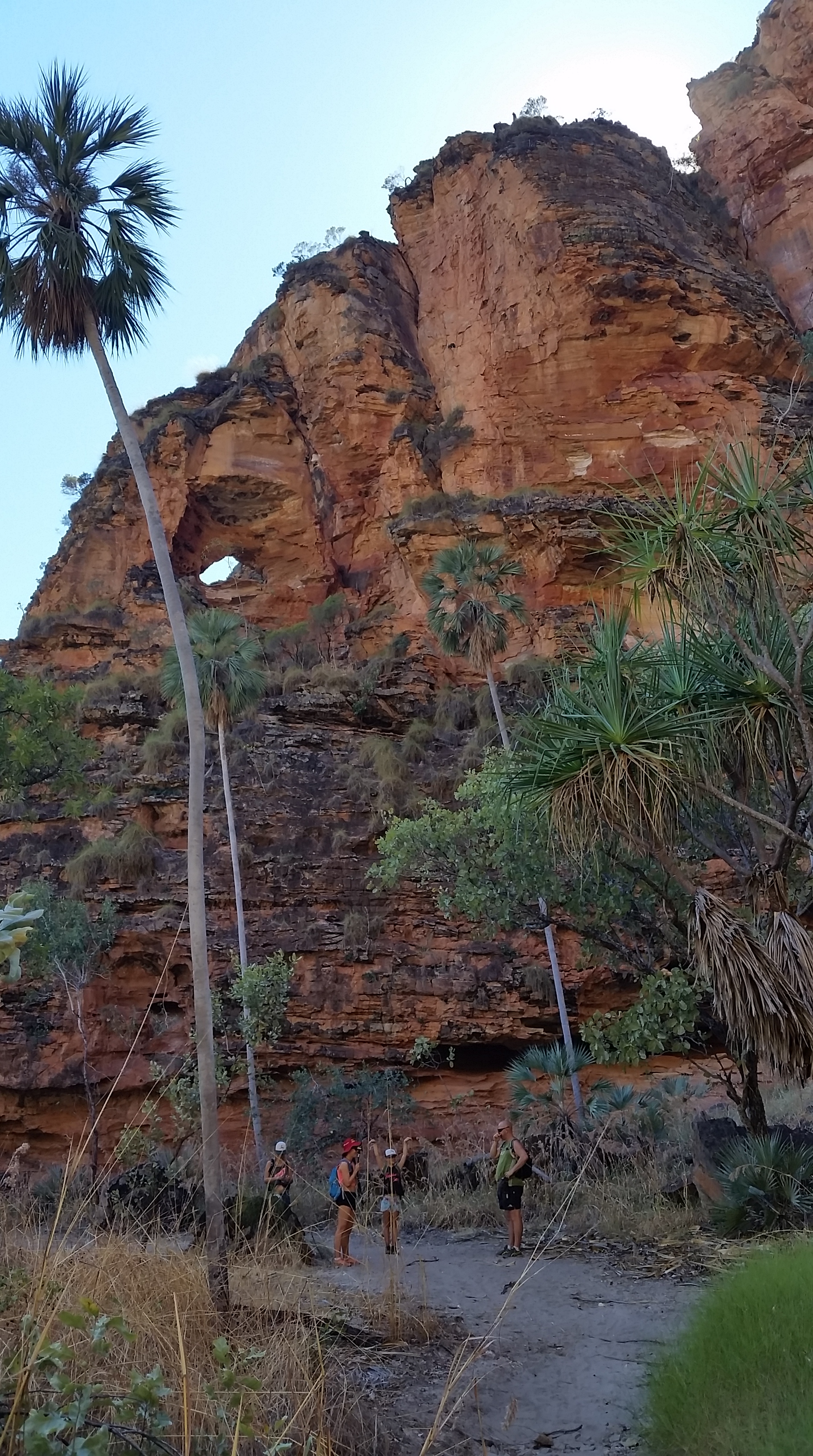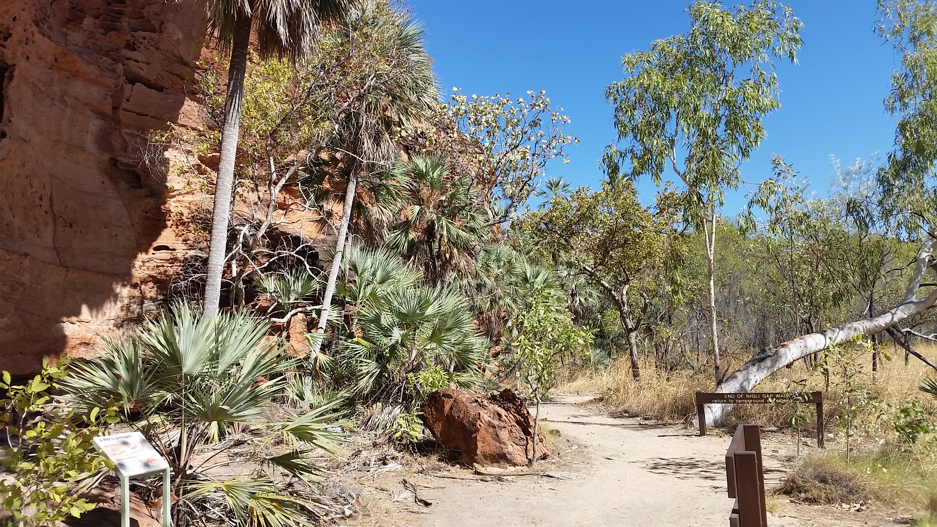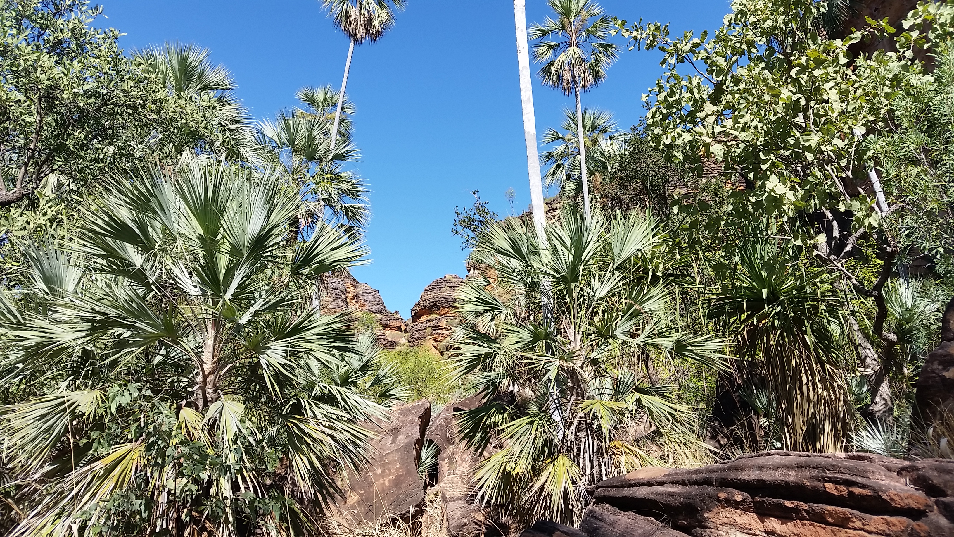 So eventually after we got ourselves organised we headed into the park a further 15km to the Jarnem campground to do the Jarnem walk. This walk was a 7km loop with shorter optional walks, however as usual we did the whole loop as we didn’t want to miss out on anything. The walk first took us to the lookout then back down and along the foot of the sandstone domes to view some aboriginal art and abundance of birdlife. Whilst we couldn’t really see the birds we could certainly hear them, they were loud and everywhere as we walked through the dry water course. Further on we came to some rock art, some of which were very hard to spot, but the main emu drawing was impressive. Along here the scenery was beautiful, the colors of the domes together with the green tropical palms and bright blue sky were incredible, unfortunately it made me fall behind as I was busy taking photos here, there and everywhere.