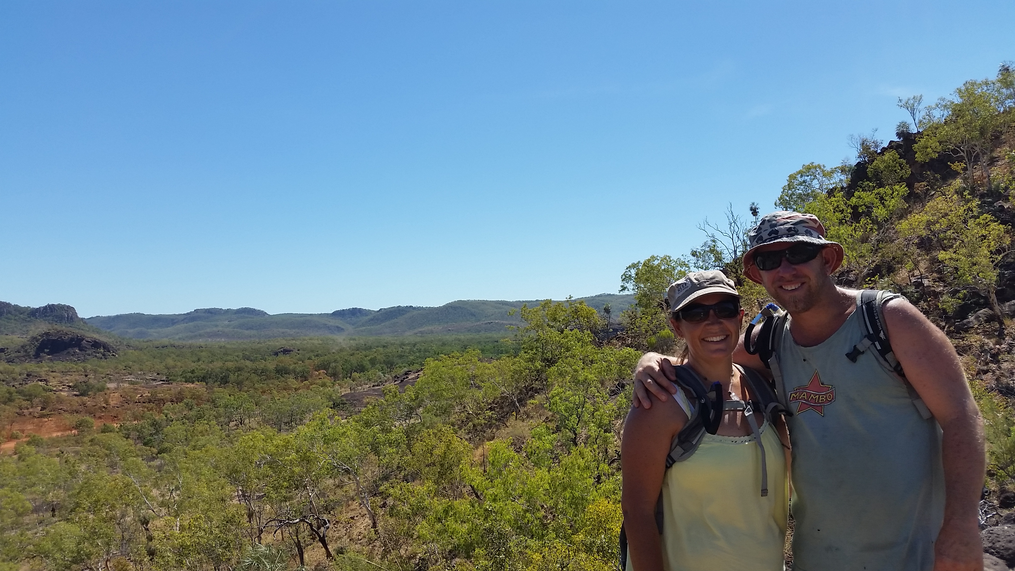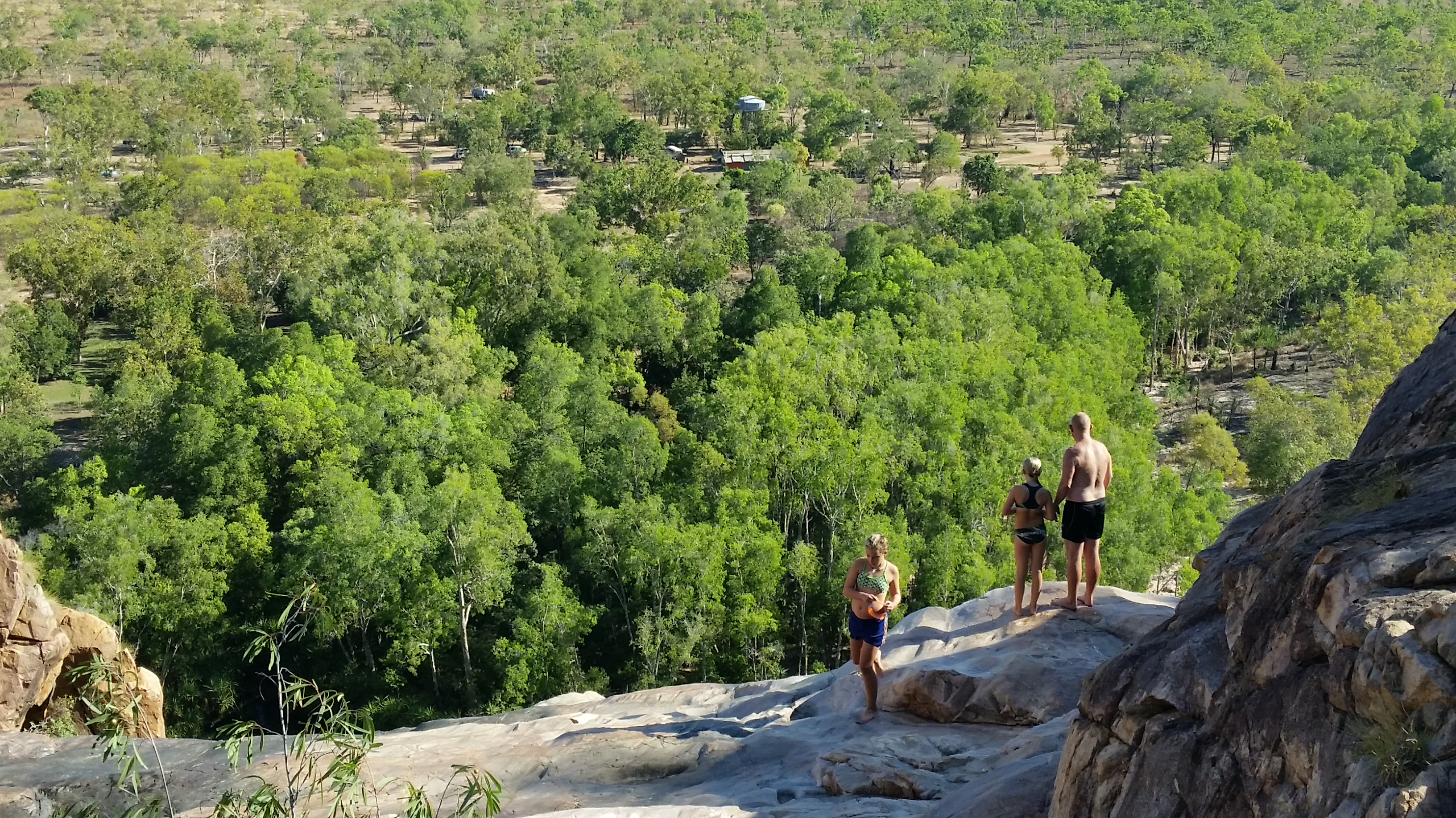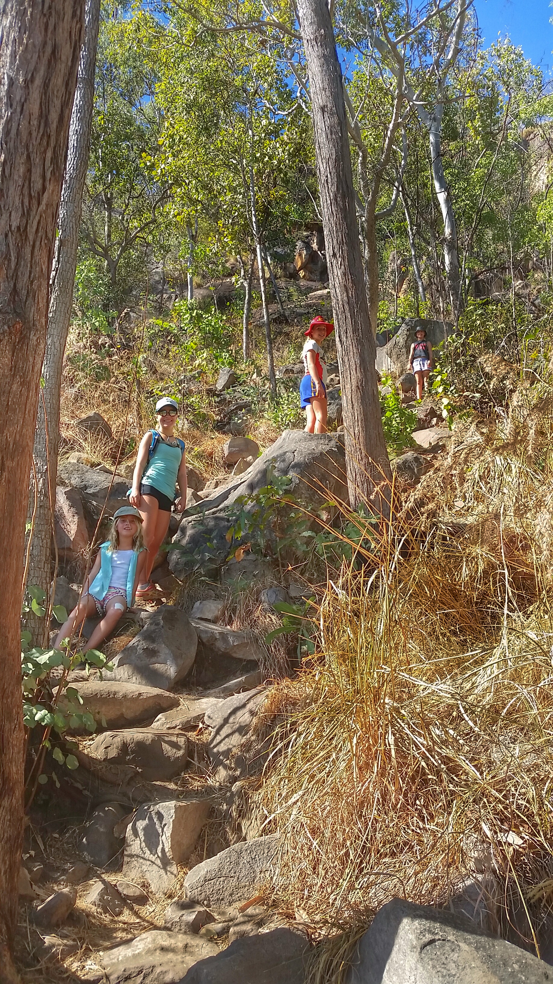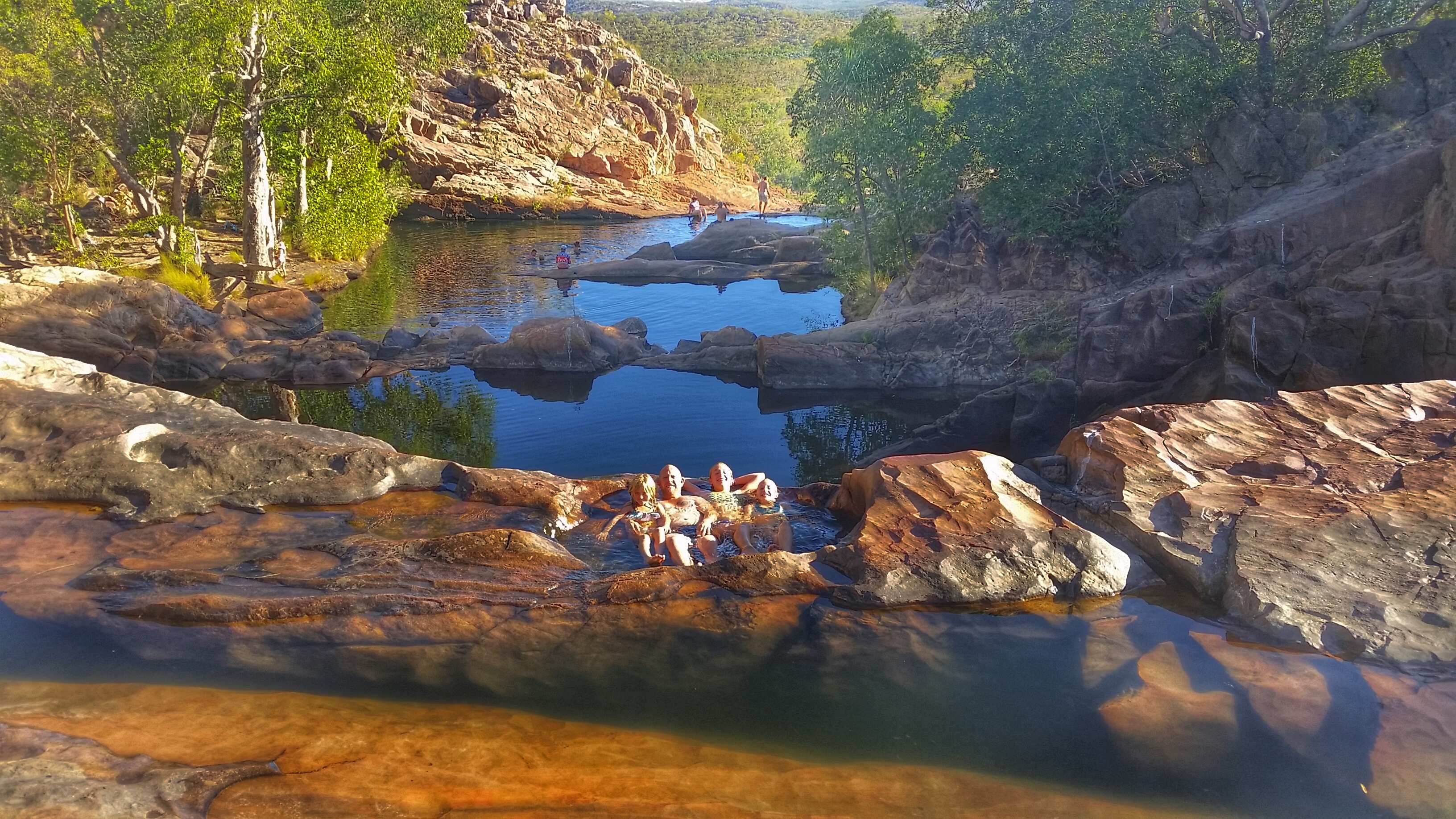After waiting out the hottest part of the day by about 3pm we decided we had had enough sitting around, so filled up our backpacks and did the 2km return hike to the top of Gunlom Falls. It was a tough hike and pretty much just went straight up for about 1km, with the track resembling a goat track, however we had read and heeded the warnings and were prepared for the heart racing climb. It was well worth the effort as the pools above the falls were amazing, even though the falls weren’t falling that much, it was enough of a trickle to keep the water from going stagnant. The rest of the afternoon was spent exploring around the pools, taking the customary photo of us in the natural infinity pool and enjoying afternoon tea up there. We even ventured further back to about the 3rd or 4th pool, where we were by ourselves and Nik and the girls were happily swimming until I noticed that we couldn’t actually see where the water came from ‘upstream’…… I rather hurriedly asked them all to hop out, because as far as I’m concerned ‘upstream’ could have been croc city and all the crocs were heading on ‘downstream’ for some afternoon tea….. So with that they scurried out of the water and we moved back up the rock embankment a few metres (at least 10!!!!).