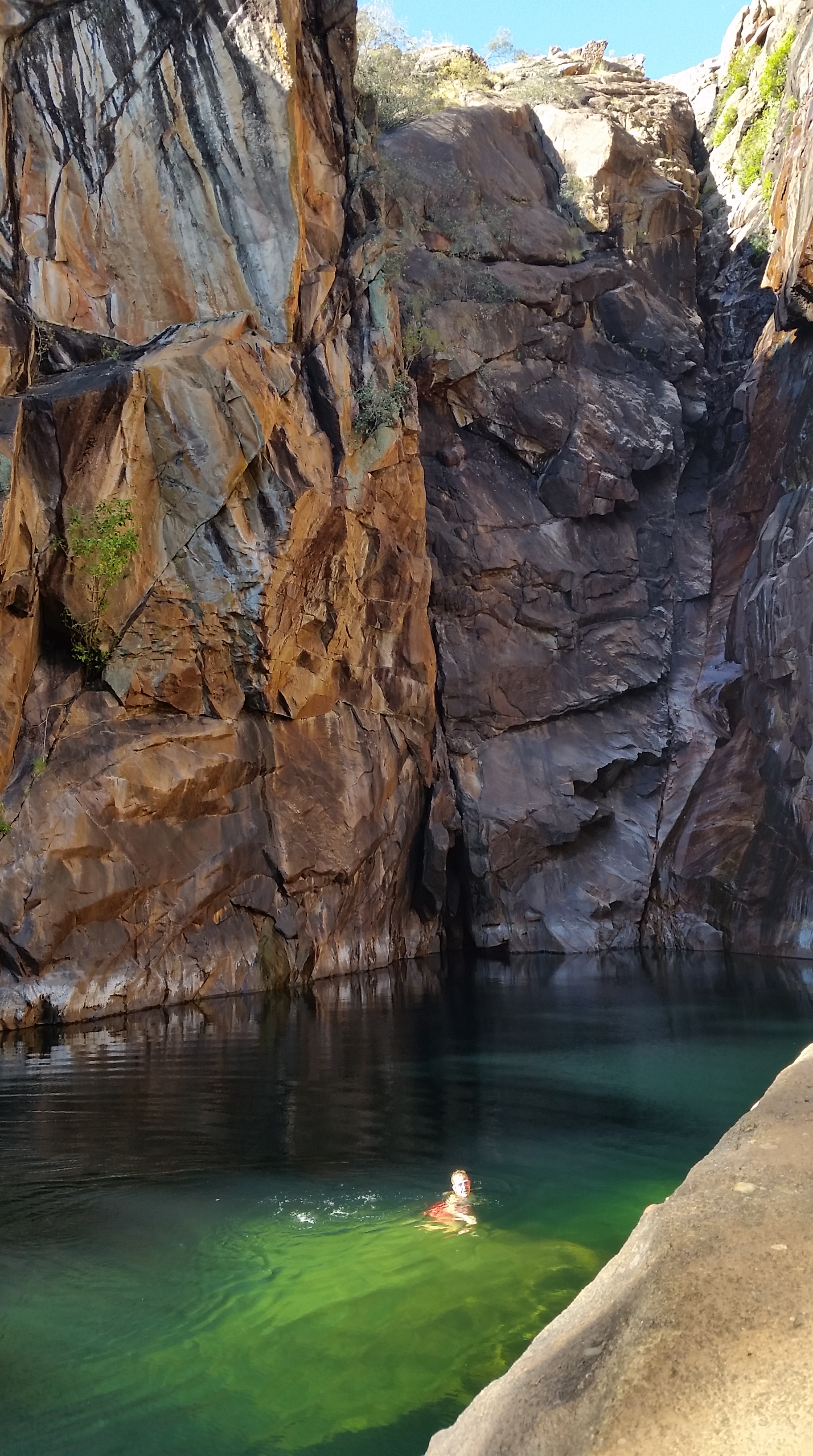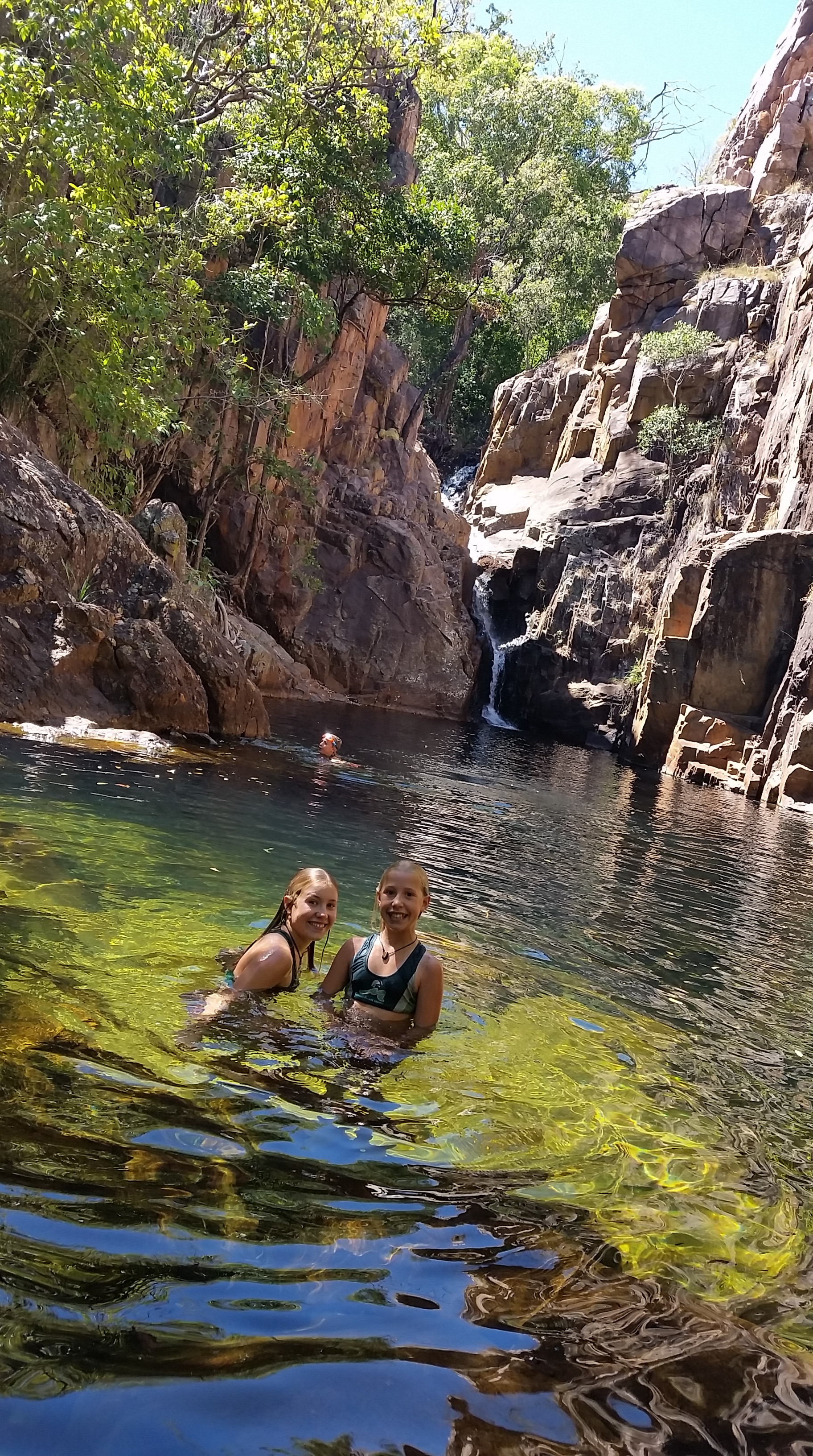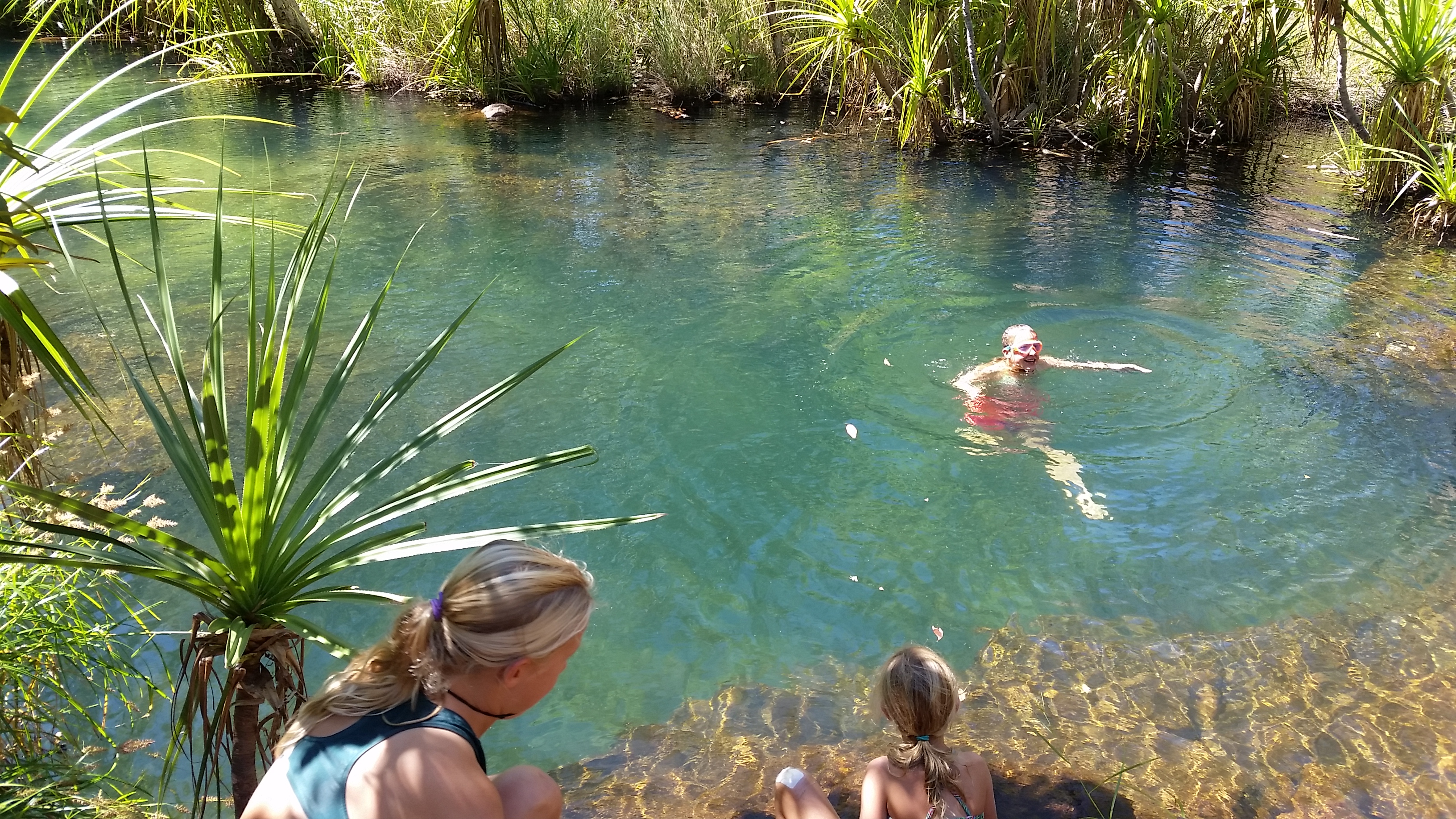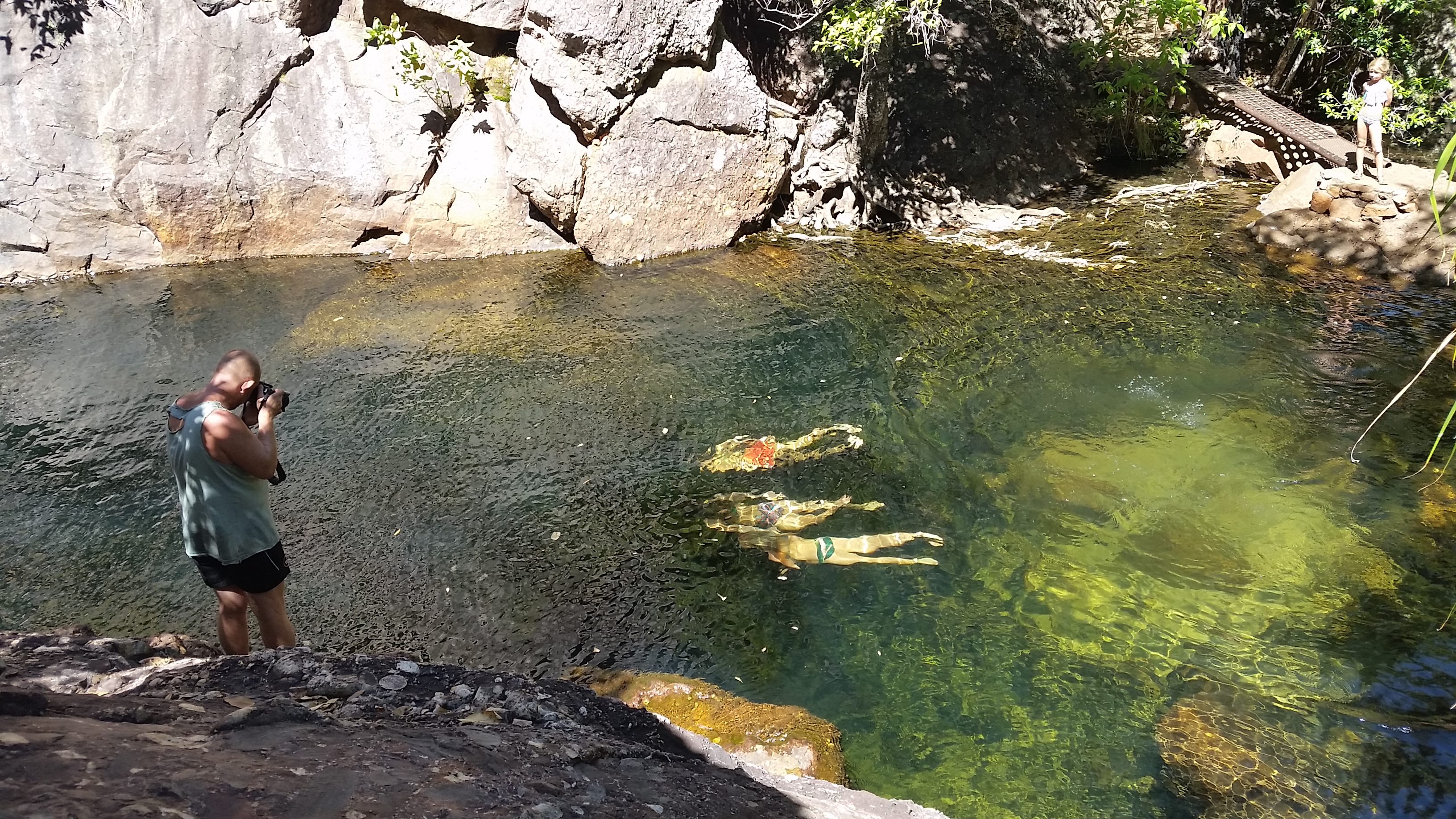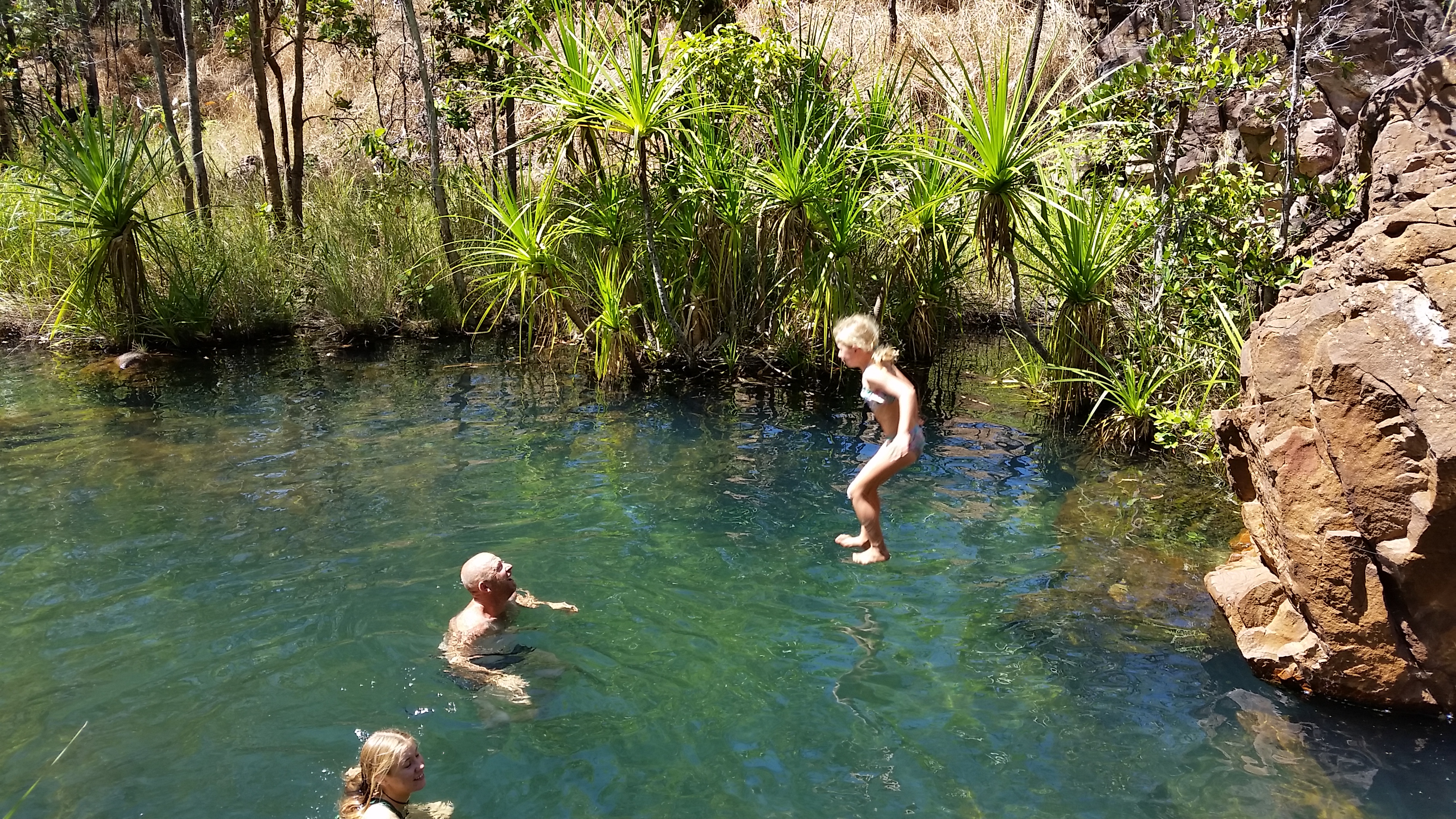 Our next secret spot involved a spring fed waterfall falling into yet another deep bottomless hole, surrounded by huge rocks. Once the croc test gave the green light we jumped and spent the next hour swimming and keeping cool, as the day had certainly warmed up. As usual Nik and the girls found some rock cliffs to jump off, either for the fun of it or just to stress me out a bit. As we were getting out we also spotted a water monitor who tried to evade us, he was a decent size and much to our disappointment was able to hold his breath and stay under water for quite a while, so much so that we got sick of waiting for him to come back up to the surface so we left. What an awesome day exploring, hiking and swimming we had!!!! We were extremely exhausted and water logged but pleased that we had been ‘wowed’ yet again. Considering before we came we hadn’t been overly excited heading into Kakadu, so far I can safely say we are loving it!!!