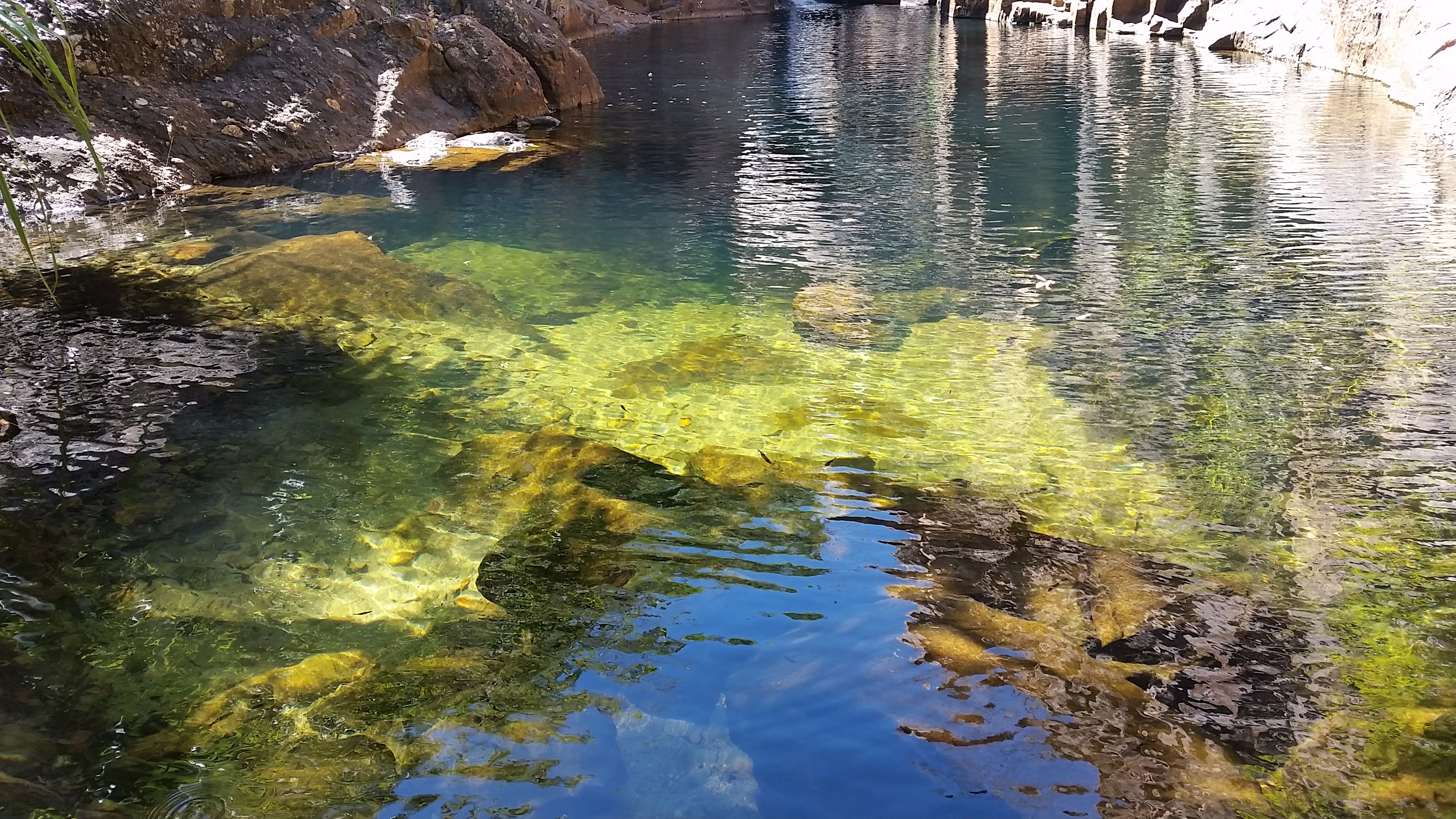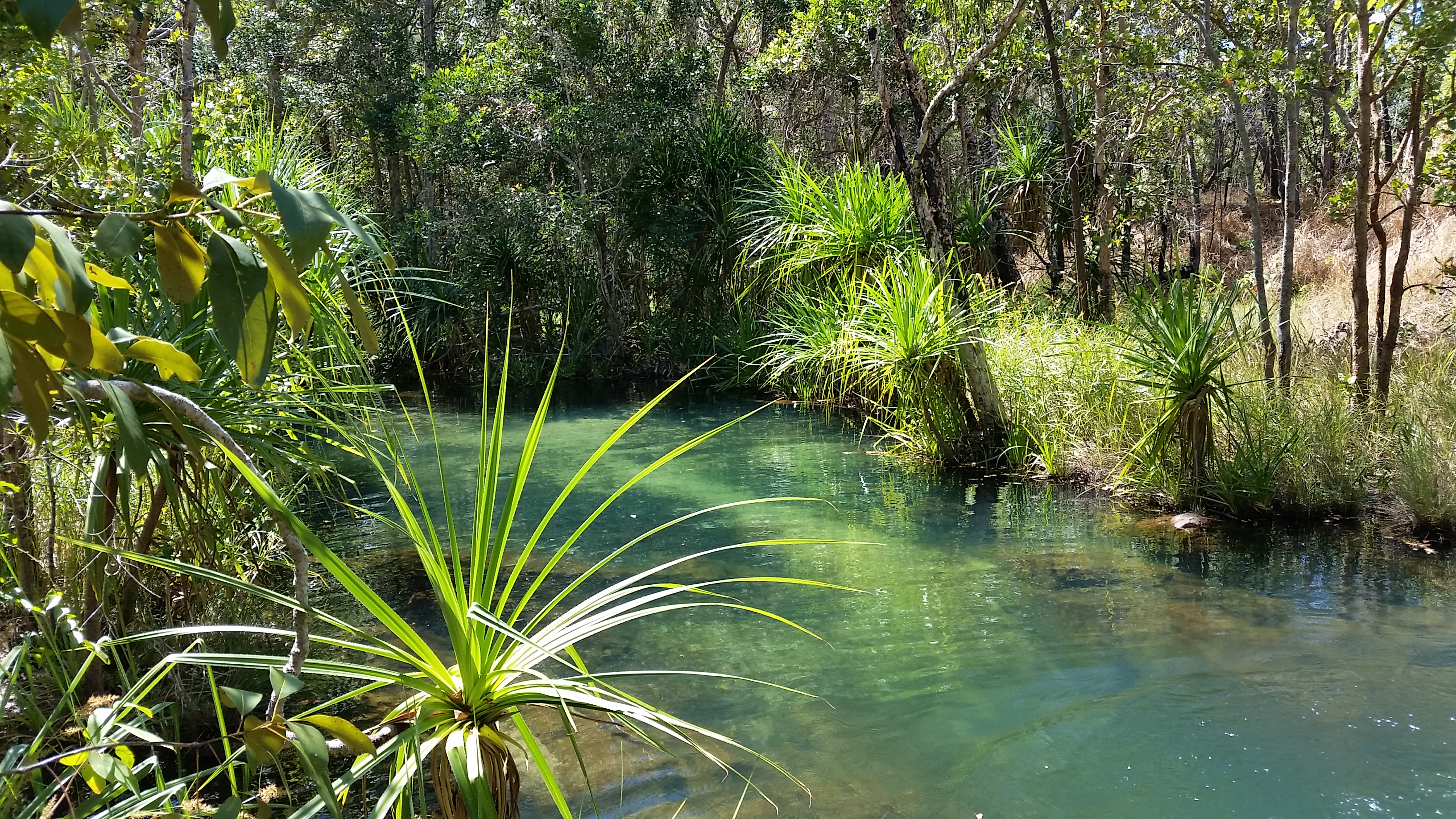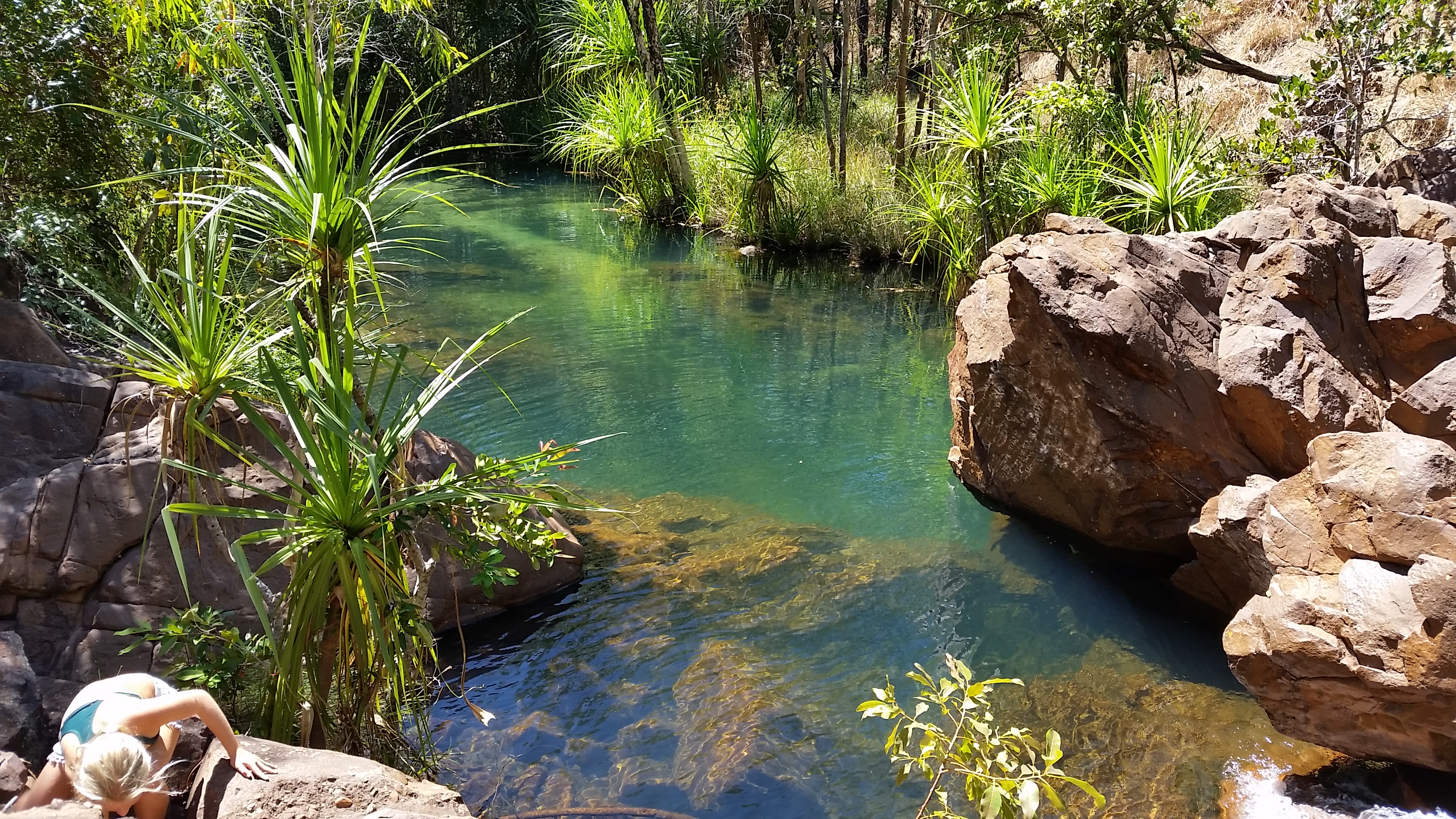 The rest of the day we spent exploring a few secret spots of Kakadu which the camp host had told us about the night before, he had to give us directions on how to get there, as neither of them were mentioned in any of the tourism books, info centres, signposted or even on Wikicamps (the traveller’s bible). The first one we found was Fern Pool and was absolutely wonderful, the water was crystal clear and it even had a sandy bottom and a 3 tier waterfall for us to enjoy. We ended up staying here for a few hours, swimming, having lunch and even spotting a turtle, whilst we were there we didn’t see another soul. Of course the camp host had told us we could swim here, but I just wanted to be doubly sure so we conducted our own 2 point ‘croc test’, first we threw decent sized rocks in the grassy shallows and any black holes we saw and waited for things to move…… once happy with that, the next step was simply to send Nik in first and wait a few minutes by pretending we were all scared to get in. If he was still happily swimming, then the water was given the all clear for the rest of us.