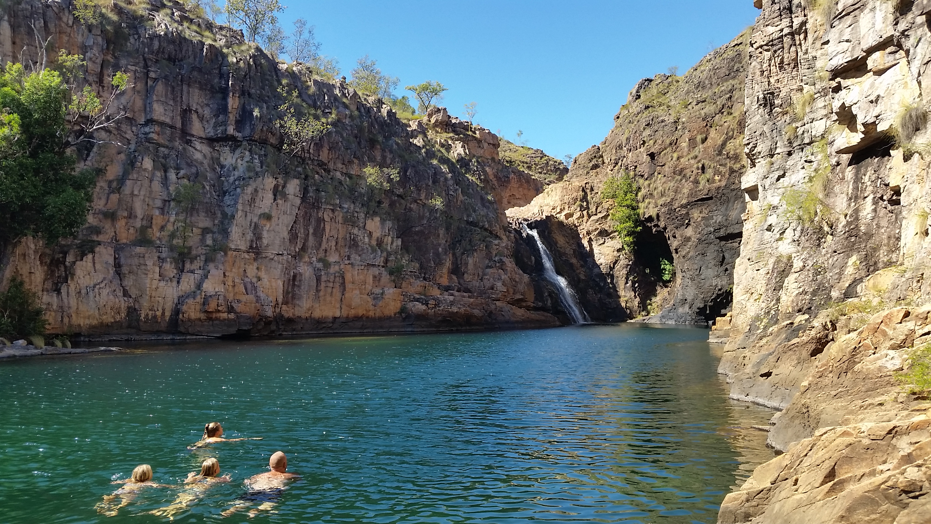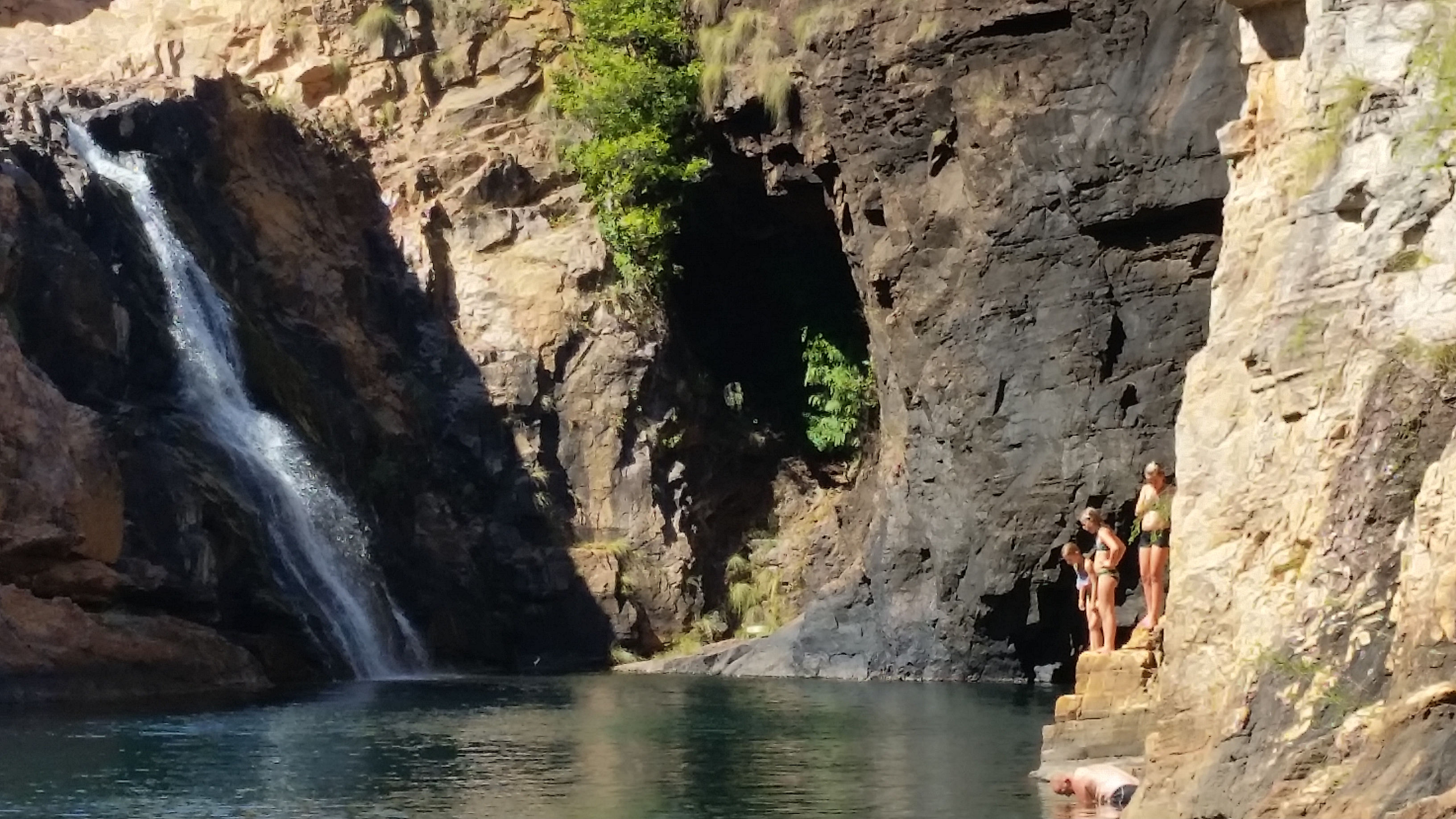 From Gunlom we packed up and headed further north, first taking a 12km detour off the highway to a stunning gorge and waterfall called Maguk. We arrived around 9:30am, found a shady spot to park the car and caravan and hiked in on a diverse tropical, rocky creek track for about 1km to be met by a stunningly large plunge and waterfall. Thankfully the tour bus that was there were leaving as we arrived, so bar another 4 people we were able to have the place to ourselves for a bit. The water was once again crystal clear, inhabited by many fish who were not afraid to come and nibble on our toes if we sat still long enough.  We soaked up the beauty of the place as we swam, once again finding some nice rocks to jump off in the warm water. We also saw some people who had hiked up the top of the falls, a hike we had decided to pass on as we were all a bit exhausted from the 20km we had hiked in the last 4 days. So instead we let our muscles relax as we floated in the beautiful water. Unfortunately our peaceful swim came to an end as more and more people started arriving, so figuring that was our cue to get going, we had a quick bite to eat and headed back, passing at least 50 people walking in and arriving back to a very full car park. Just in the nick of time too, as a car tried to park right in front of us blocking our way out, to which we politely told them to move their car…… Manoeuvring our way out of the carpark we headed back to the highway, heading north towards our next adventure and destination on our OZLAP……………….