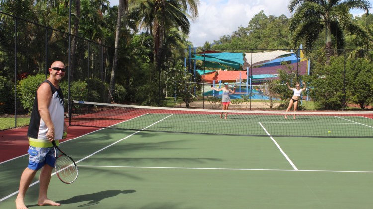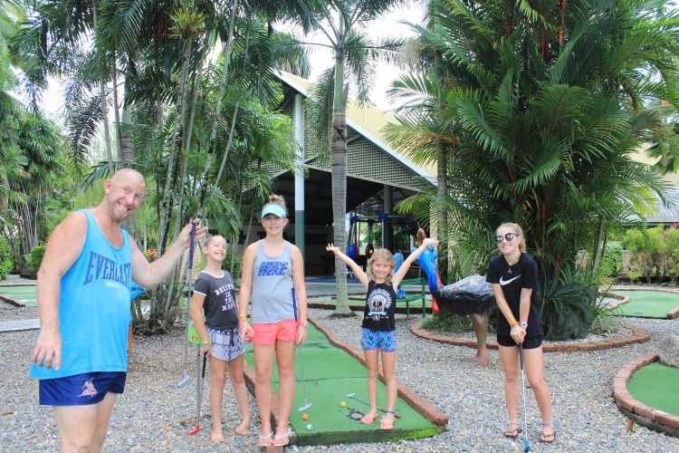 Given that we were in Cairns, we couldn’t pass through without having stayed at Cairns Coconut Resort, which is ranked as the number one caravan park in Australia, which the prices clearly indicated……. Given that we arrived just before the start of the busy tourist season, I was able to score a deal in which we got two kids free, which bought the price down to a double didgit number, that if I tried really hard, I could justify spending so much per night….. We managed to completely justify spending 4 nights at Coconut, which coincided with the arrival of Pauley and Queen Jayne (friends and workmates from Darwin), on their next work stop. With so many ‘things ‘ to do in the park, the kids had a ball, whilst Nik and I caught up with Paul and Jayne.  Each morning, Nik, Bec and Zoe did a session at the air conditioned gym, then after breakfast we would head down for a swim in each of the 2 resort pools, before we made our way along the BMX bike track and playground towards the water park, complete with the monster water dumping bucket. After a quick morning tea we would head back out for a quick hit of tennis and a game of 2 on 2 on the basketball court, then back via the pools for a cool off. After lunch we rested…… but not for long, as we still needed to fit in a game of mini golf before we cooled off again in the pools. After quickly shoving down our dinner, we then shipped off the younger 2 girls to the games room where there was a nightly movie, ones they’d seen before, but we still made them go as we had paid good money for it!!!!!