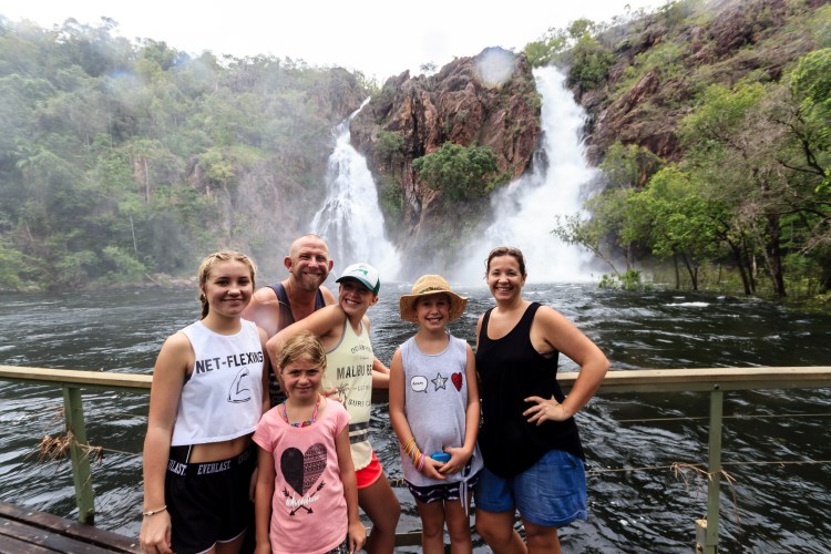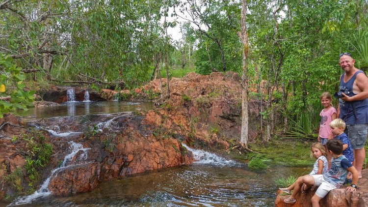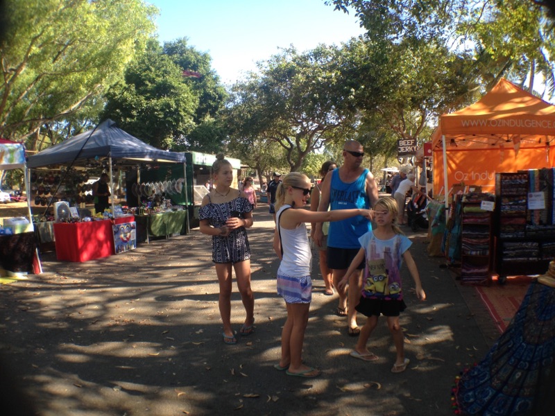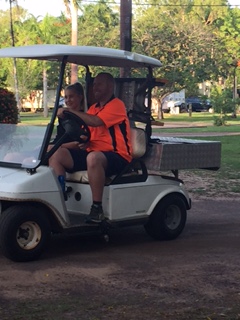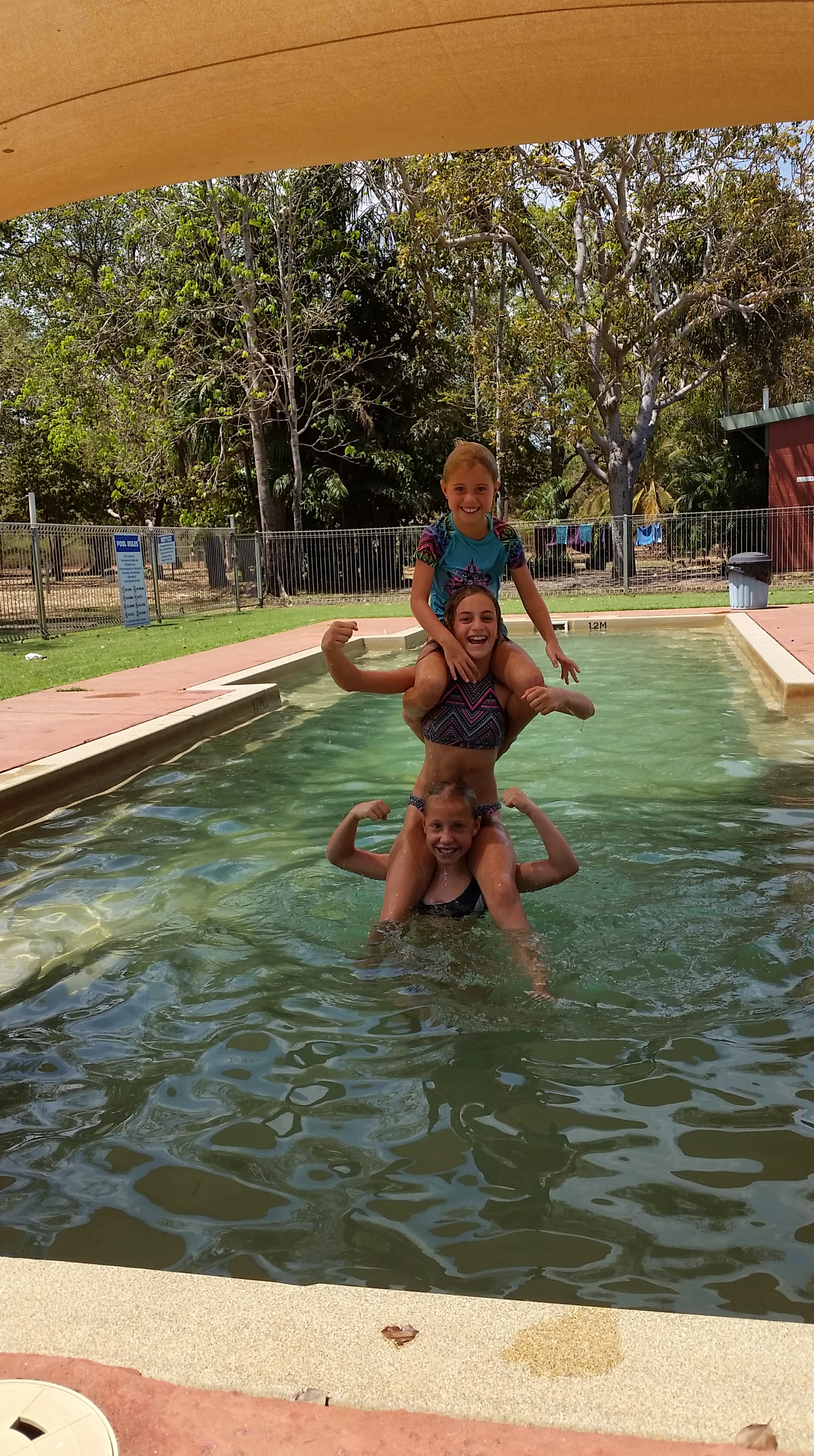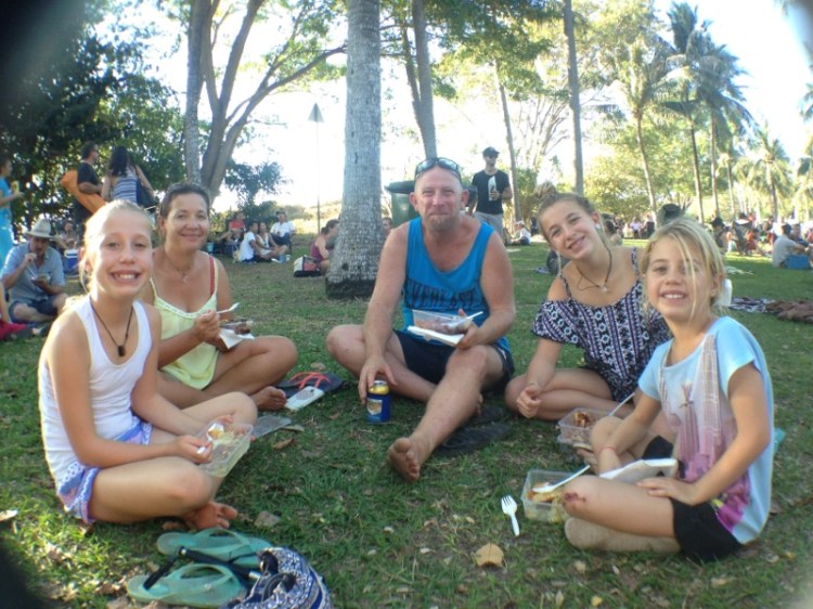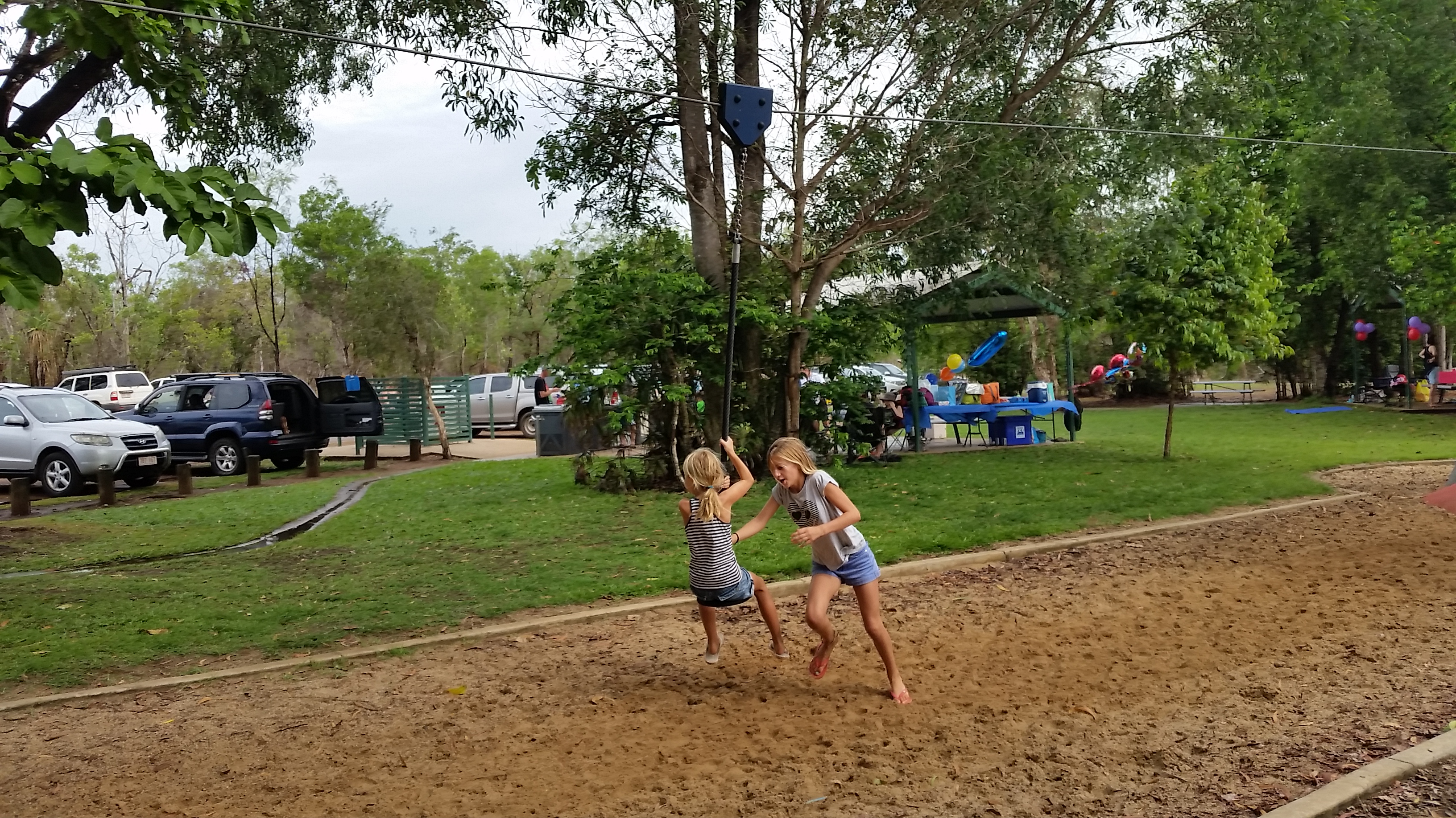 Unfortunately our plans for Punsand Bay never eventuated as we did a wheel bearing on the van, conveniently just as we were driving past the service station and spare parts/ mechanic in Bamaga. After pulling into the service station to investigate the loud screeching noise and burning rubber smell coming from the van, Nik quickly determined the cause and headed off over the road to the mechanic, who was able to quickly ring his supply man in Cairns and get two bearings sent up on the plane to Bamaga, he promised it would be there that afternoon on the 4:30pm plane. So with that promise, we set the kids up on the picnic table doing schoolwork, whilst Nik went about cleaning what was left of the bits and pieces around the bearing (at least thats what I think he was cleaning…..). We should have listened to the few locals we spoke to throughout the day, as we explained to them what was happening, all of them simply replied, ‘I’ll believe that when I see it, it’s TI (Thursday Island) time up here mate!!!’ Needless to say they were spot on and after waiting an hour after we had watched the plane fly over the top of us to land at the airport, we had to admit defeat and go to plan B. Plan B was for Nik to sling up the axle with a chain and drive the relaxing 8km back to the caravan park at Seisia with only 3 tyres………