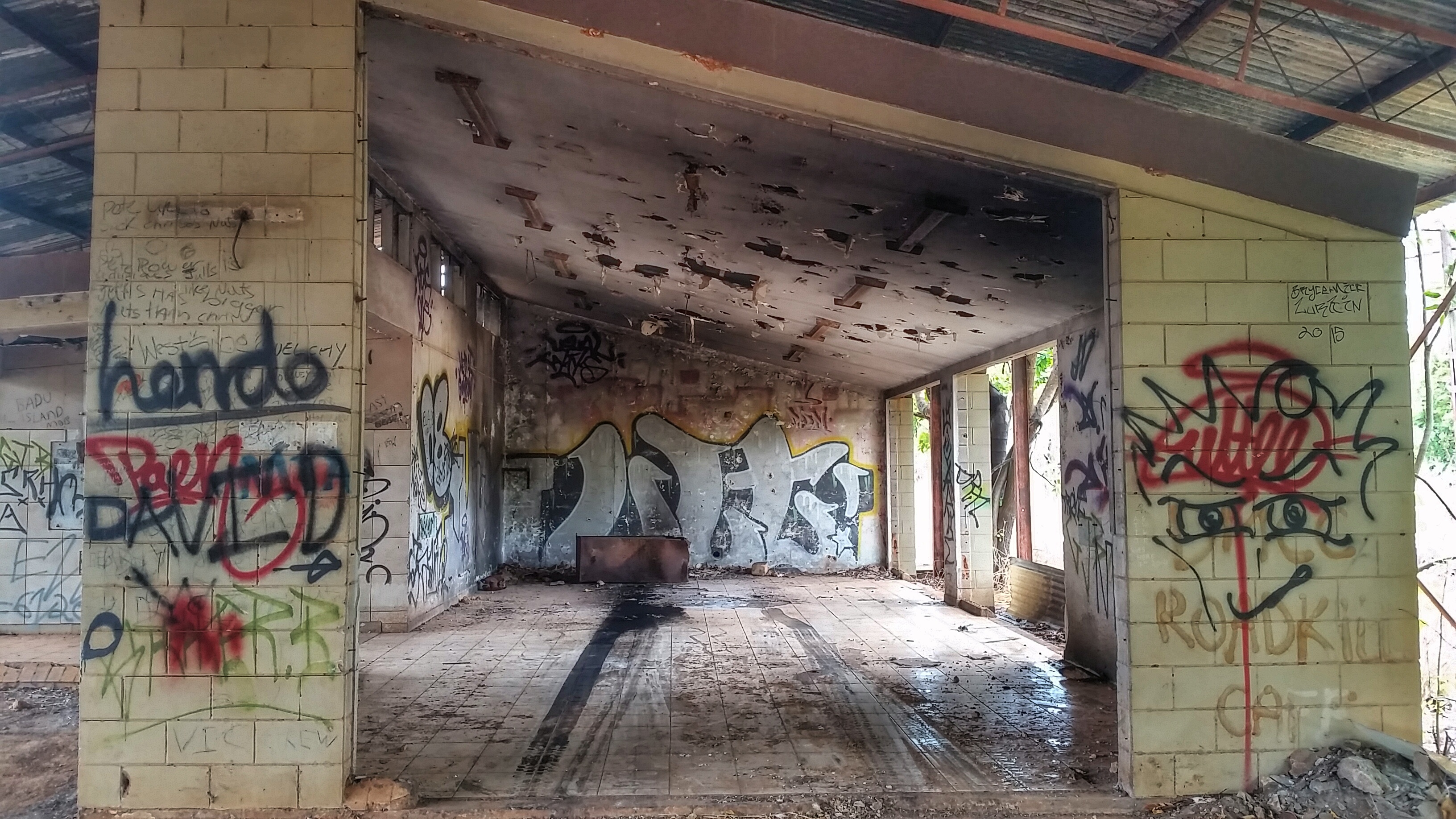 Less than 100metres before the road ends and the last hike to the tip begins, there is a group of old buildings that were once known as the ‘Pajinka Lodge’. According to our research, the lodge was brought by the government at the expense of the tax payer and was then handed over to the communities up here, where unfortunately and for whatever unknown reason, it stayed open for only a few months and then closed its doors for good. These days, as the photos show, it has been trashed, ransacked and damaged beyond repair, we were only able to walk through a few of the main buildings, being the reception, bar, restaurant, kitchen, laundry, a few close by rooms and the pool, that was filled with thick sludgy green water that none of us were brave enough to go near, god knows what was at the bottom…… It was quite sad really, but then it would have been a mammoth, quite expensive task for anyone to keep open, given the remoteness of the area, perhaps the government could have done a bit more homework before going and spending countless amount of dollars on such an ill-fated project.